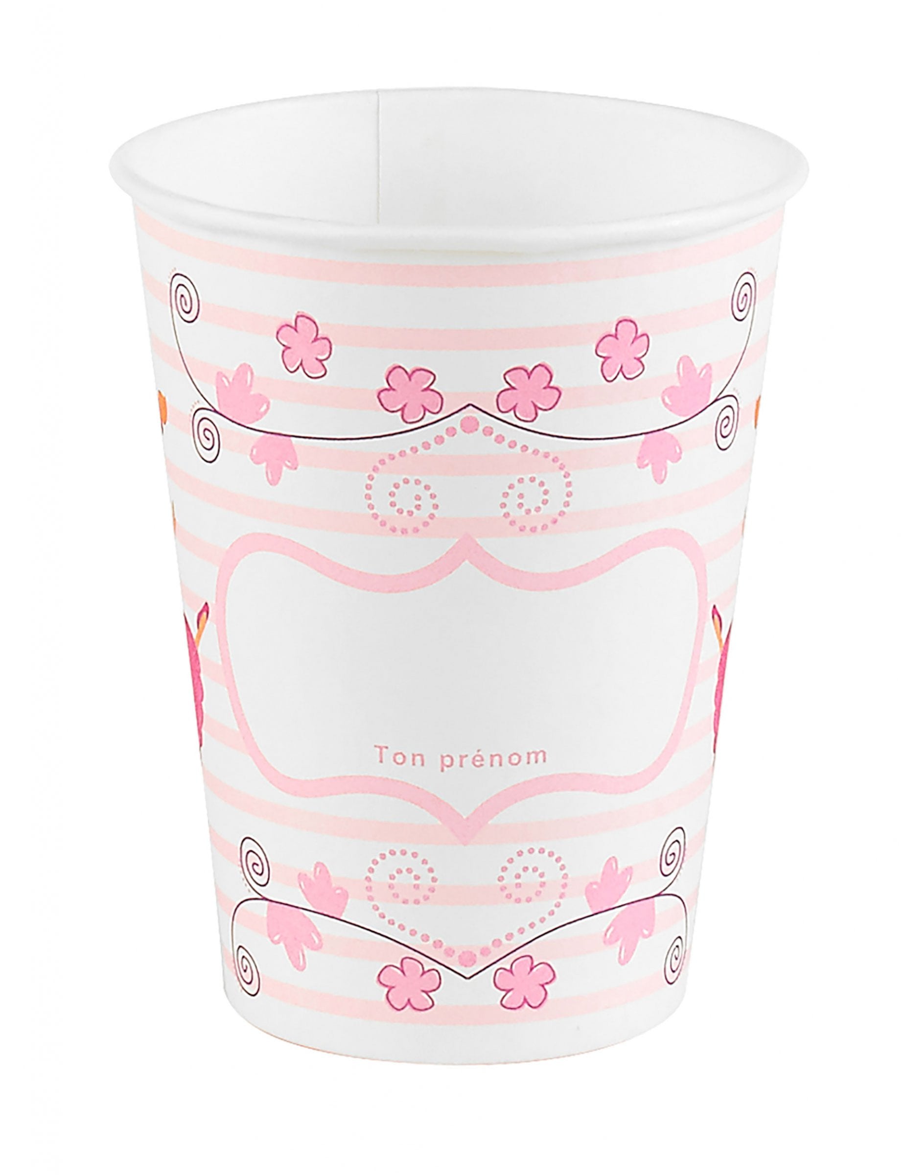 Ezeket a kartonpoharakat nagyon 8 -ban adják el. Körülbelül 25 CL meleg vagy hideg italt tartalmazhatnak. Kb. 9,5 cm, átmérője körülbelül 7,5 cm. Fehér színű, rózsaszín csíkokkal, kis virágokkal és balerina táncos díszítik őket. 3 különböző balerinas modellt talál. Hátul egy fehér doboz lehetővé teszi a vendégek keresztnevének regisztrálását, hogy ne veszítsék el italukat. Ezek az eldobható csészék tökéletesek lesznek a kedvenc italok kortyolására a kis táncos születésnapi snackje során!