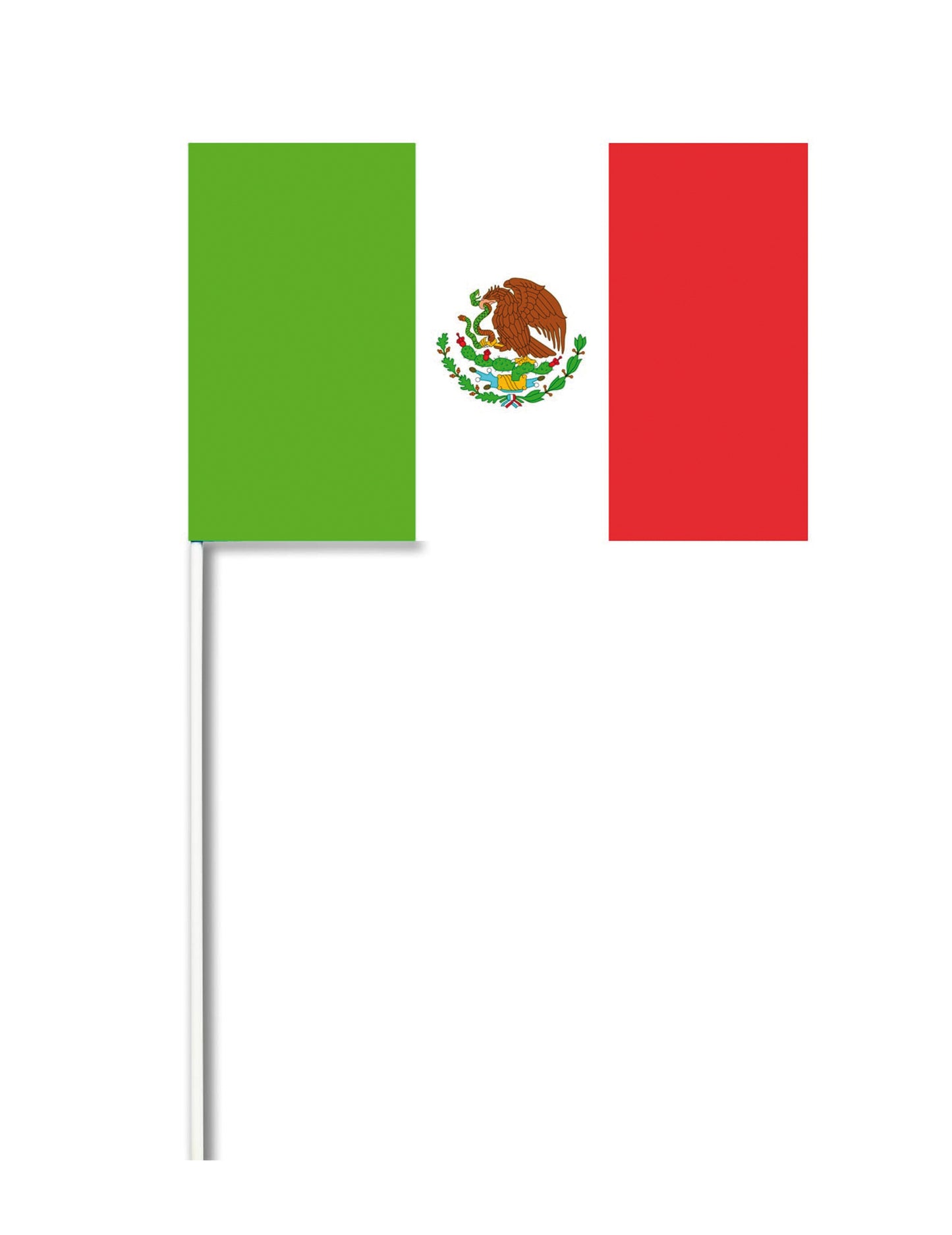 Ez a zászló papírból készül. Ez Mexikó színeit képviseli, és körülbelül 14 x 21 cm -t mutat. Ez a zászló egy fehér botot tartalmaz, amely lehetővé teszi, hogy könnyen kézzel tartsa. Tökéletes lesz elviselni kedvenc országát egy sporteseményre!