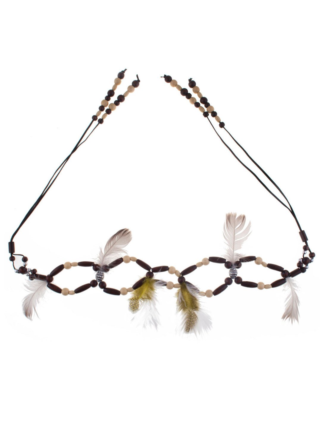 Ez az indiai öv felnőtteknek szól. Ez az öv kettős sor sötétbarna és bézs fa gyöngyből készül. Ez a két gyöngy sor összefonódik, hogy kerekeket képezzen, amelyek között hamis bézs és sárga tollak. Ez az öv, amely az Amerindian -ban megjelölt stílusban, ideális lesz a ruhájának befejezéséhez egy este alatt, amelyet az indiánok és a cowboyok, vagy a Farwest témájára álcáztak, vagy egyszerűen a karnevál idején.