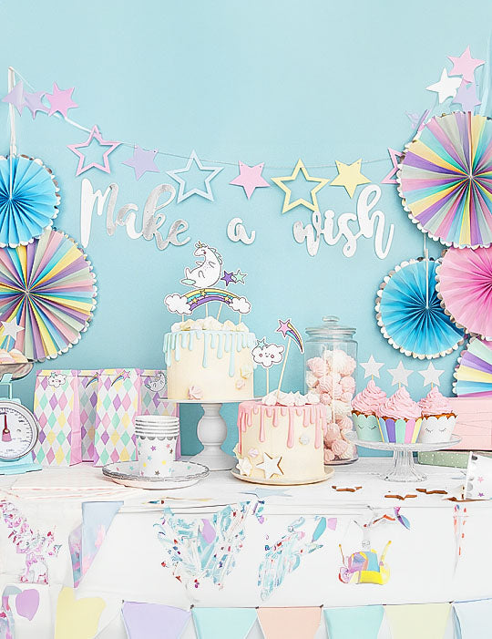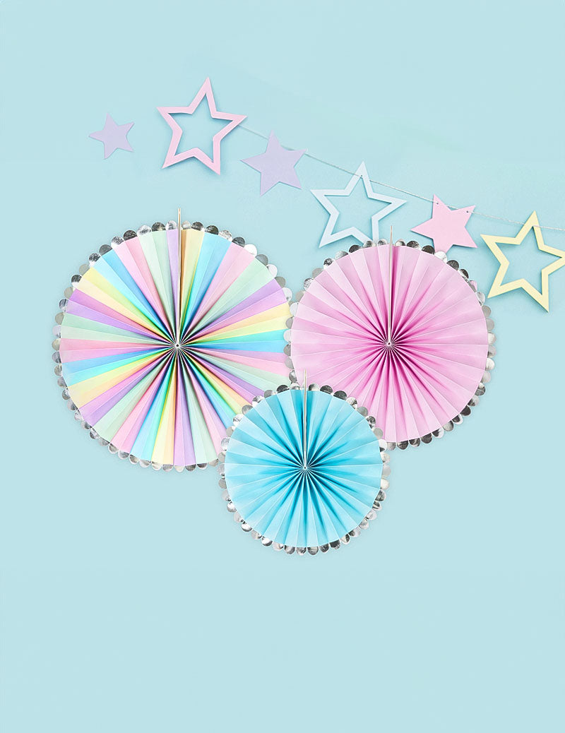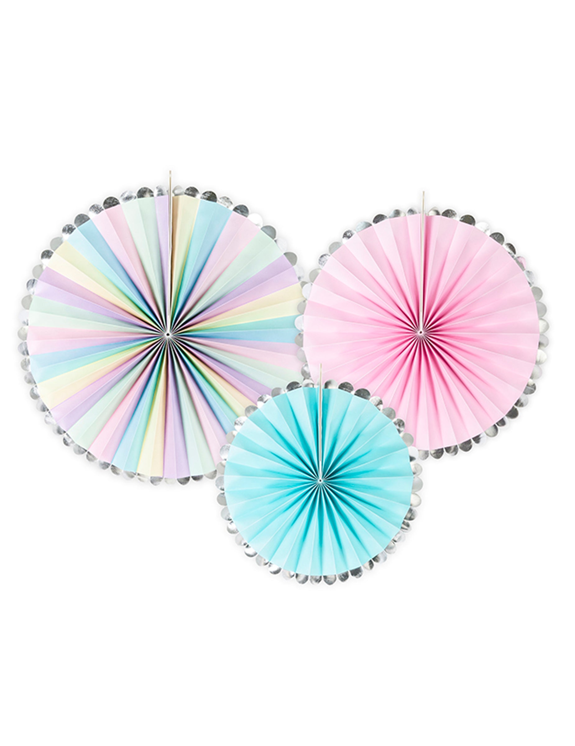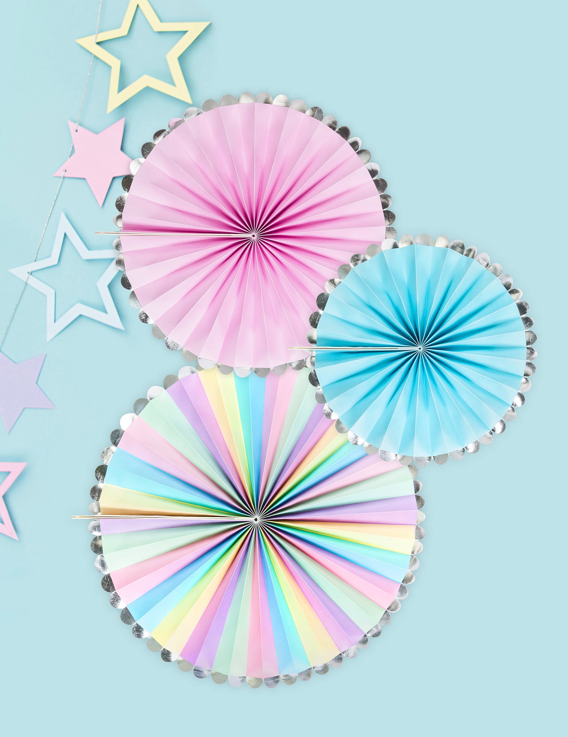 Ezeket a rozettákat 3 -ban értékesítik. Ezek dekoratív rozetta pasztell és ezüst színekben. Ezek 21, 25 és 30 cm -t mérnek, és többszínű karcolásokkal és ezüst szegélyekkel díszítik. Használhatja őket a szoba dekorációjához pasztell születésnapja, egy témájú parti, keresztelés vagy baba zuhany alatt!