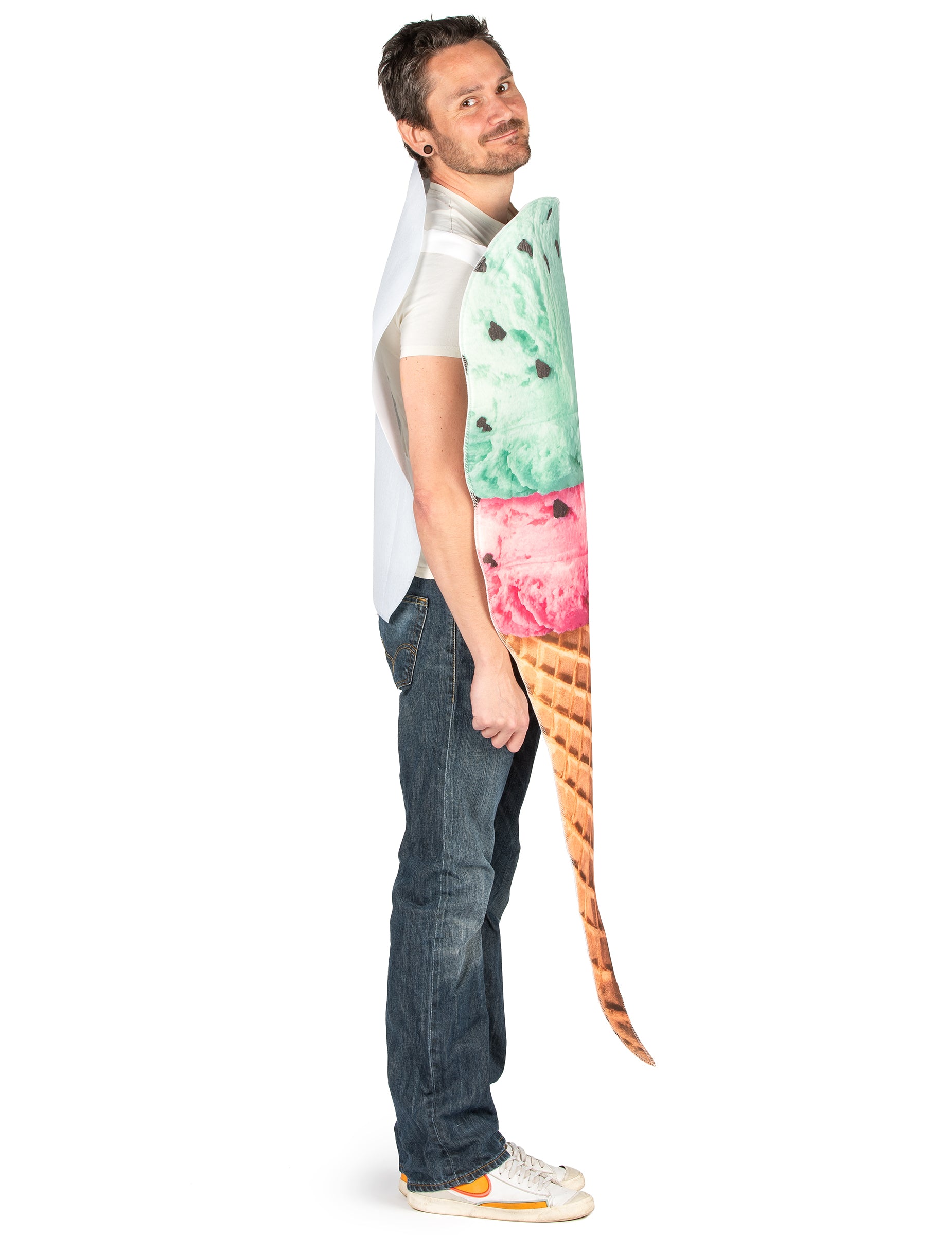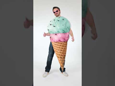 Ez a felnőtt fagylalt jelmez egy nyitott ujjatlan tunikából áll, karokkal és fejekkel. A szett rugalmas habból készül, amelyet két jéggolyó borítva van nyomtatva. A lehető legnagyobb mértékben étvágygerjesztéssel ez a trompe l'oeil jégjelmek formájában a Cornet -ben ideális lesz arra, hogy barátainak egy nyári partija alatt vágyakozzanak!