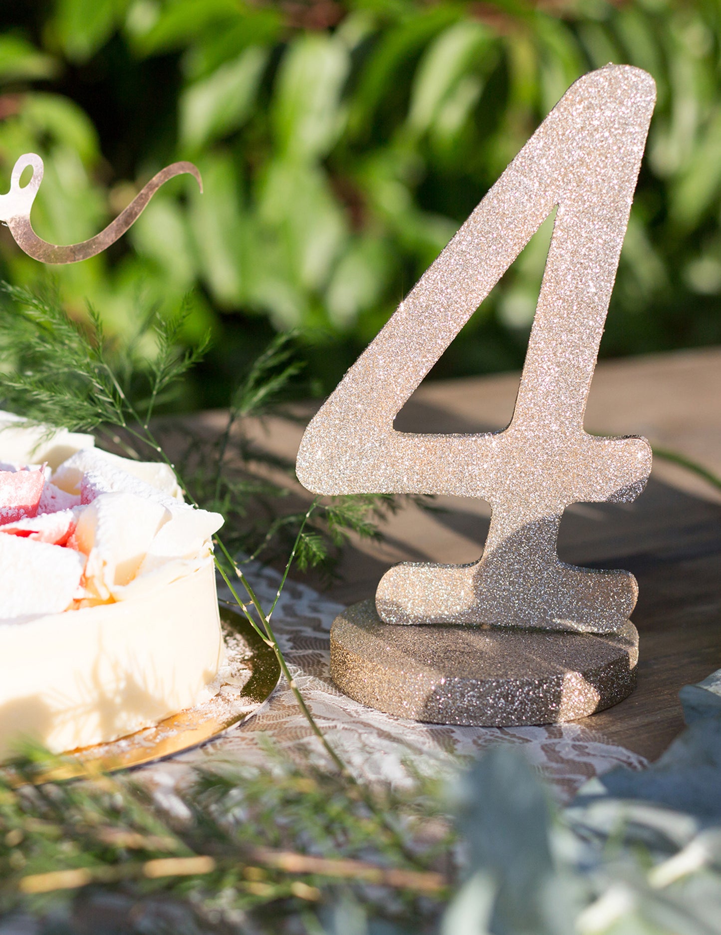 Ez a középpont a 4. számot képviseli, és egy alapon tartják. A pezsgő színű csillogó fában van, és körülbelül 20 cm magas. Ez a dekoráció ideális lesz az ünnepi asztalokhoz.