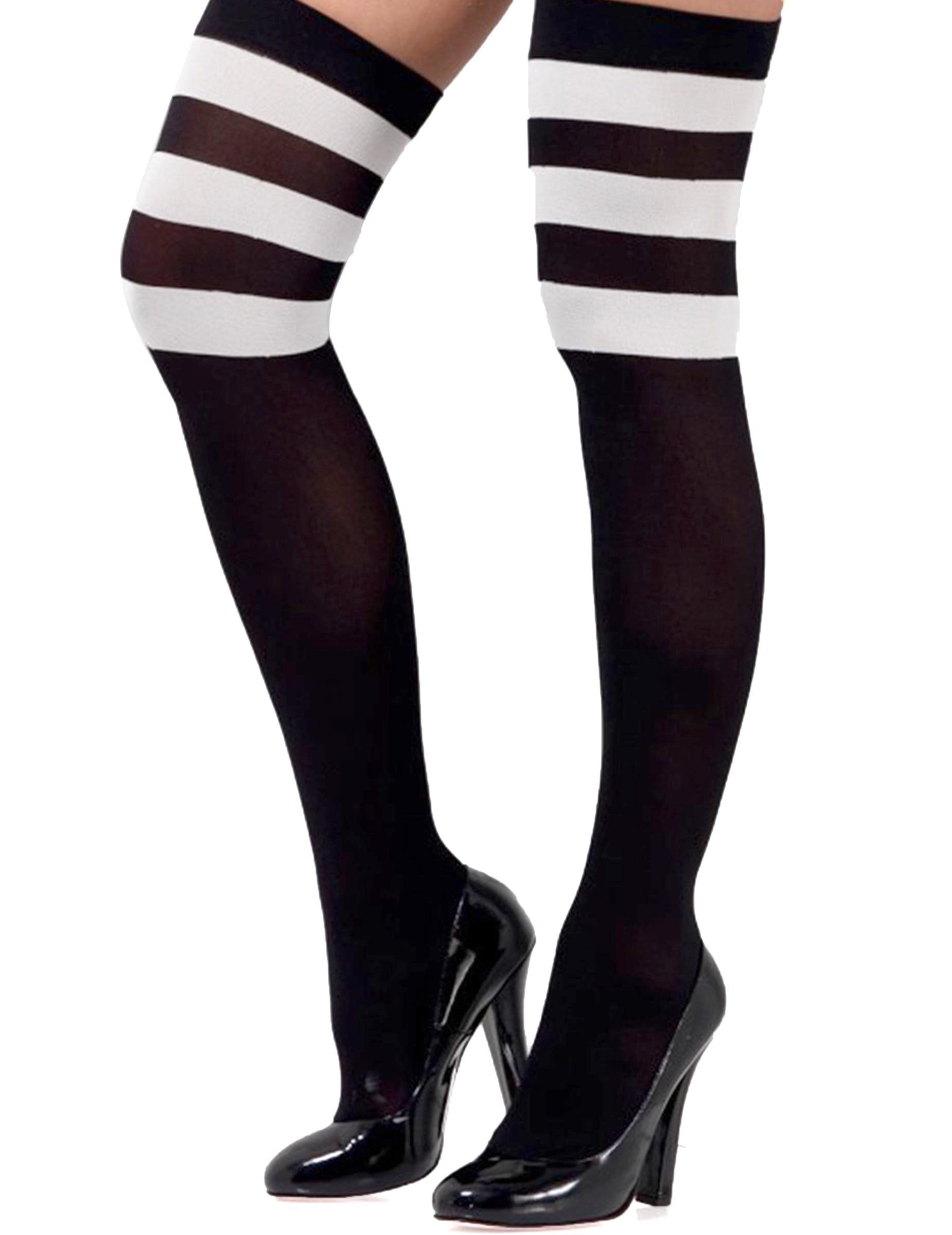 Ez a tétel pár fekete harisnyát tartalmaz a nők számára (cipő nem tartalmazza). Ezek a fekete harisnyák átlátszatlanok, és a tetején 3 fehér karcolással vannak díszítve. Ez a harisnyatartomány tökéletes lesz egy pompomlány vagy táncos álruhájának kitöltésére egy álruhás partira vagy a karnevál idején!