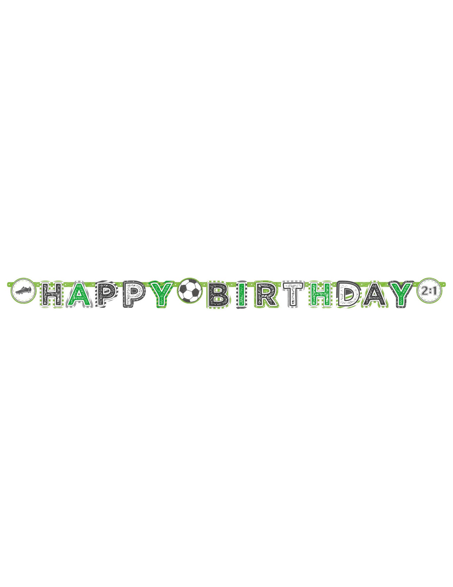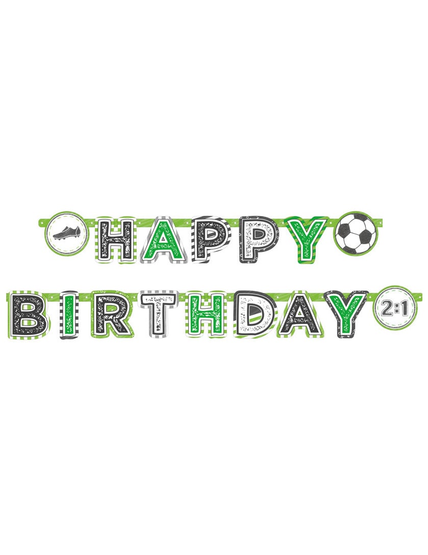 Ez a karton koszorú körülbelül 2 m hosszúságú. A "Boldog születésnapot" üzenetet sportolja, amelyet matricák vesznek körül, amely egy görcs, egy golyó és egy ponttábla képét viseli. A betűk körülbelül 15 cm magas, fekete, fehér és zöld. Ez a Garland tökéletes lesz egy futball témájú dekoráció létrehozásához egy születésnapi partiján.