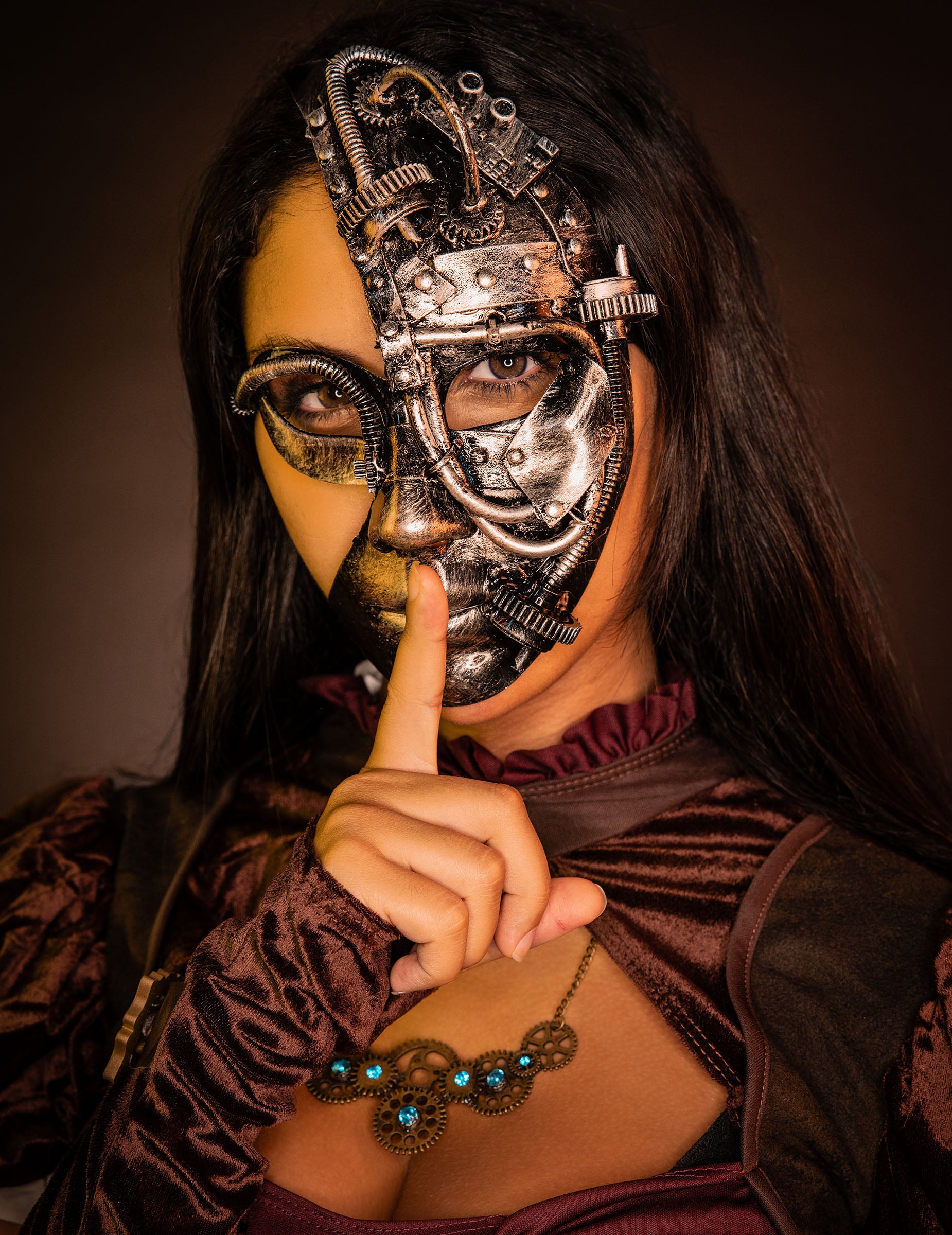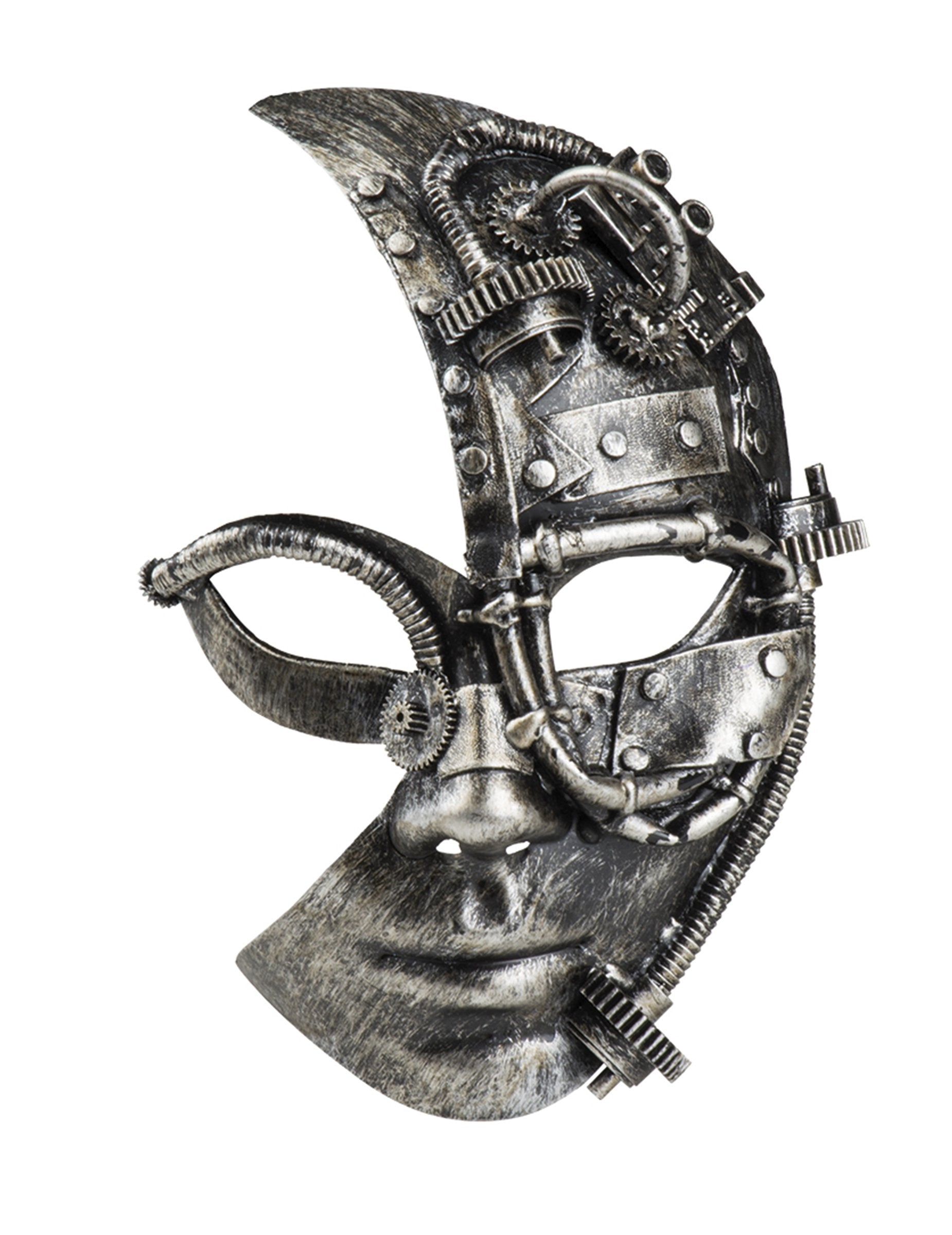 Ez a kiegészítő egy félmaszk robot steampunk a nők számára. A fekete ezüst műanyag félmaskot fogaskerekek és csövek díszítik. Nyílásai vannak a szemében, az orrában és a szájban, és a fej hátulján egy rugalmassággal vannak rögzítve. Ez a félmaszk robot steampunk a nők számára befejezi futurisztikus megjelenését a tökéletességhez!