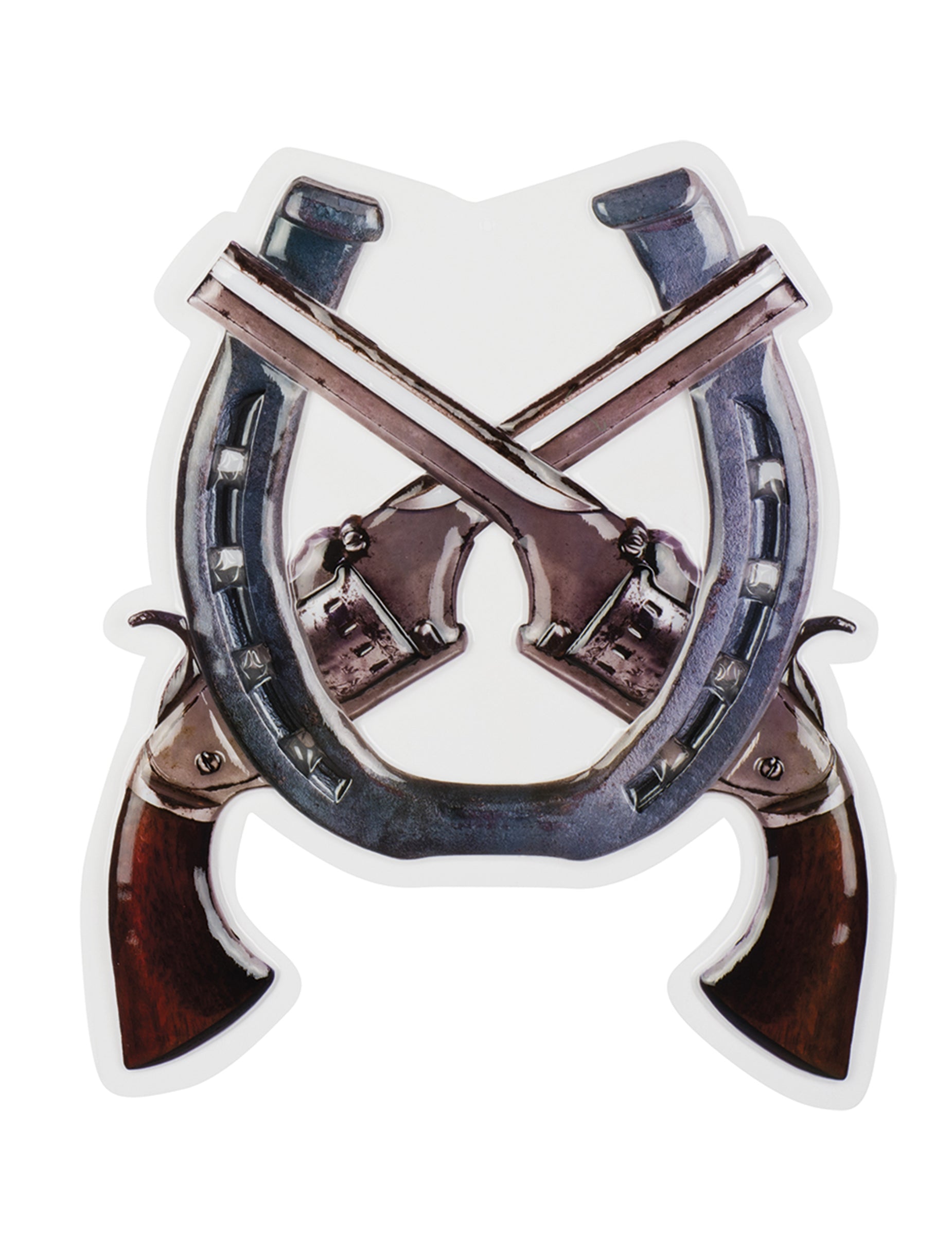 Ez a tétel egy inin -gyulladásos fali dekorációból áll. Ez a PVC dekoráció körülbelül 47 x 40 cm -t mér. Ez 2 cowboy pisztolyt képvisel, amelyet patkóval kereszteznek, ez a dekoráció tökéletes lesz a szoba dekorációjának a nyugati témáján!