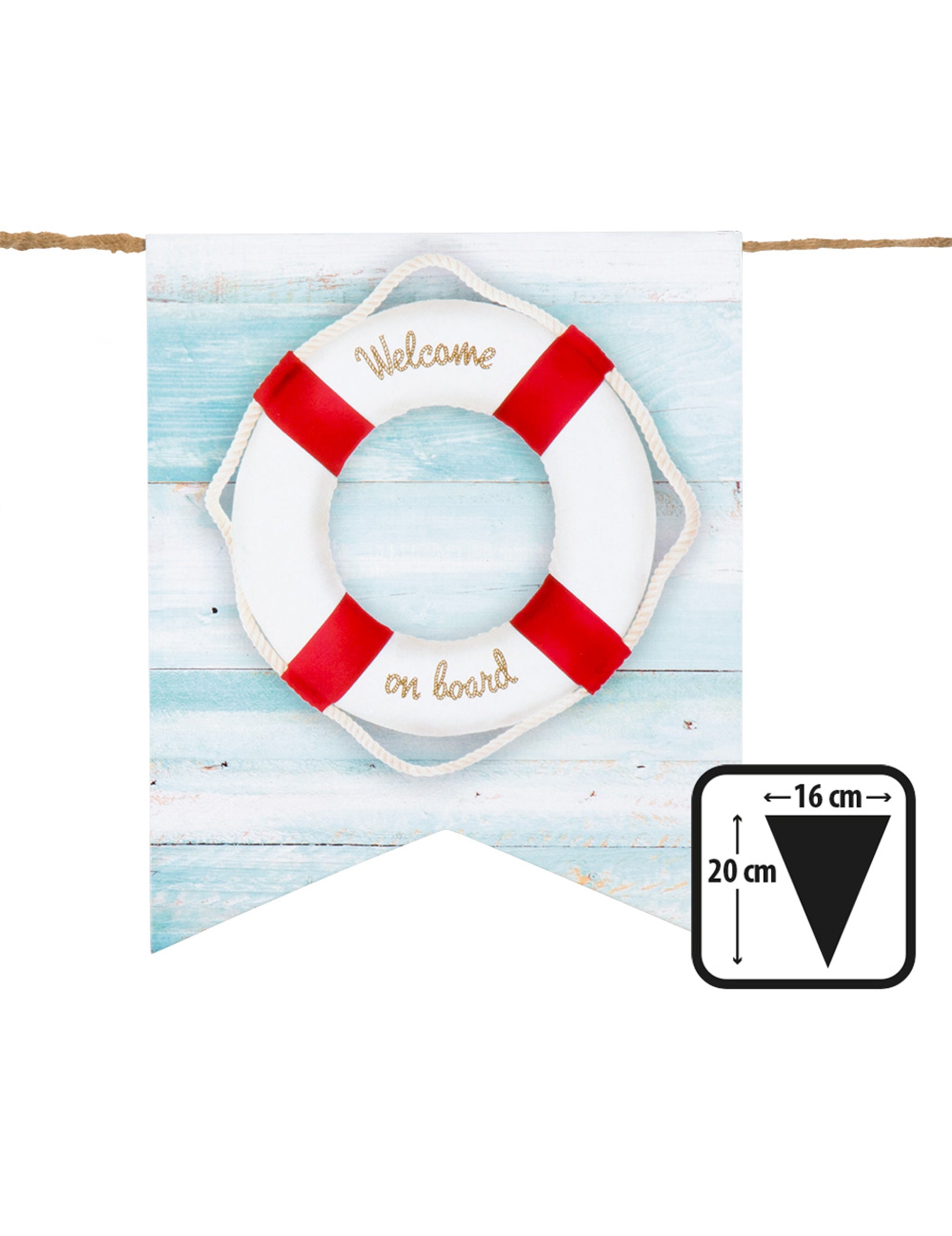 Ez a tengeri szalaghirdetés 11 zászlóból áll, dupla oldalra nyomtatva. A Garland zászlókkal ellátott, mentőkötél díszítve, fehér fa háttérrel. Körülbelül 4 m hosszú. Ez a tengeri szalaghirdetés a tökéletes kiegészítő, amely nagyon nyári érintést biztosít. Díszít egy partit a tenger témáján.