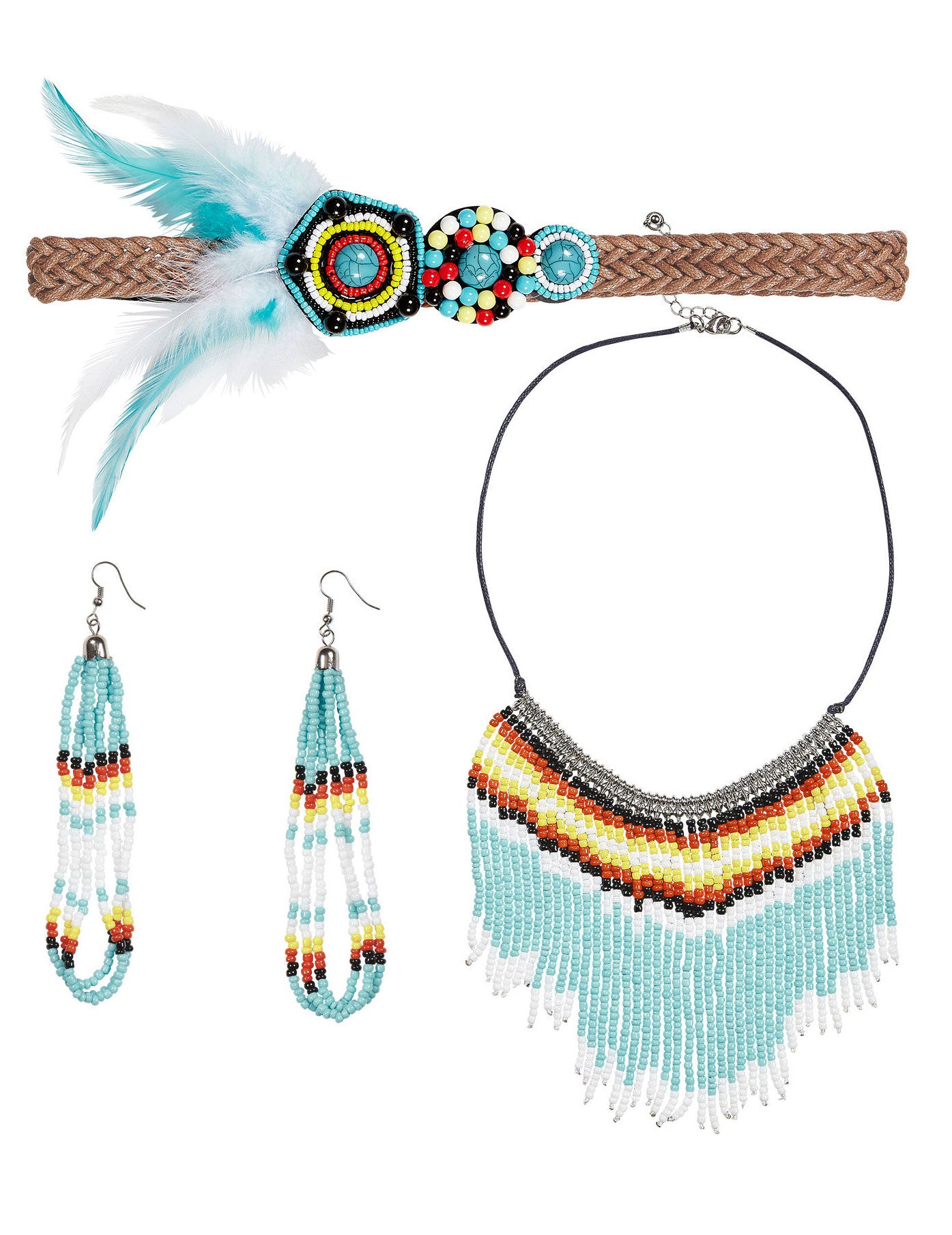Ez az indiai kiegészítők tétele fejpántból, nyakláncból és egy pár fülbevalóból áll. A nyak és a hosszú fülbevalók türkizkékből, kék, fehér, piros és fekete gyöngyből képződnek. A fejpánt barna, ugyanazokkal a gyöngyökkel és tollakkal díszítve. Ezek az indiai kisasszony ékszerek a nők számára kitöltik az Amerindian jelmezt a karneválra vagy egy álruhás estére. Copyright Widmann SRL