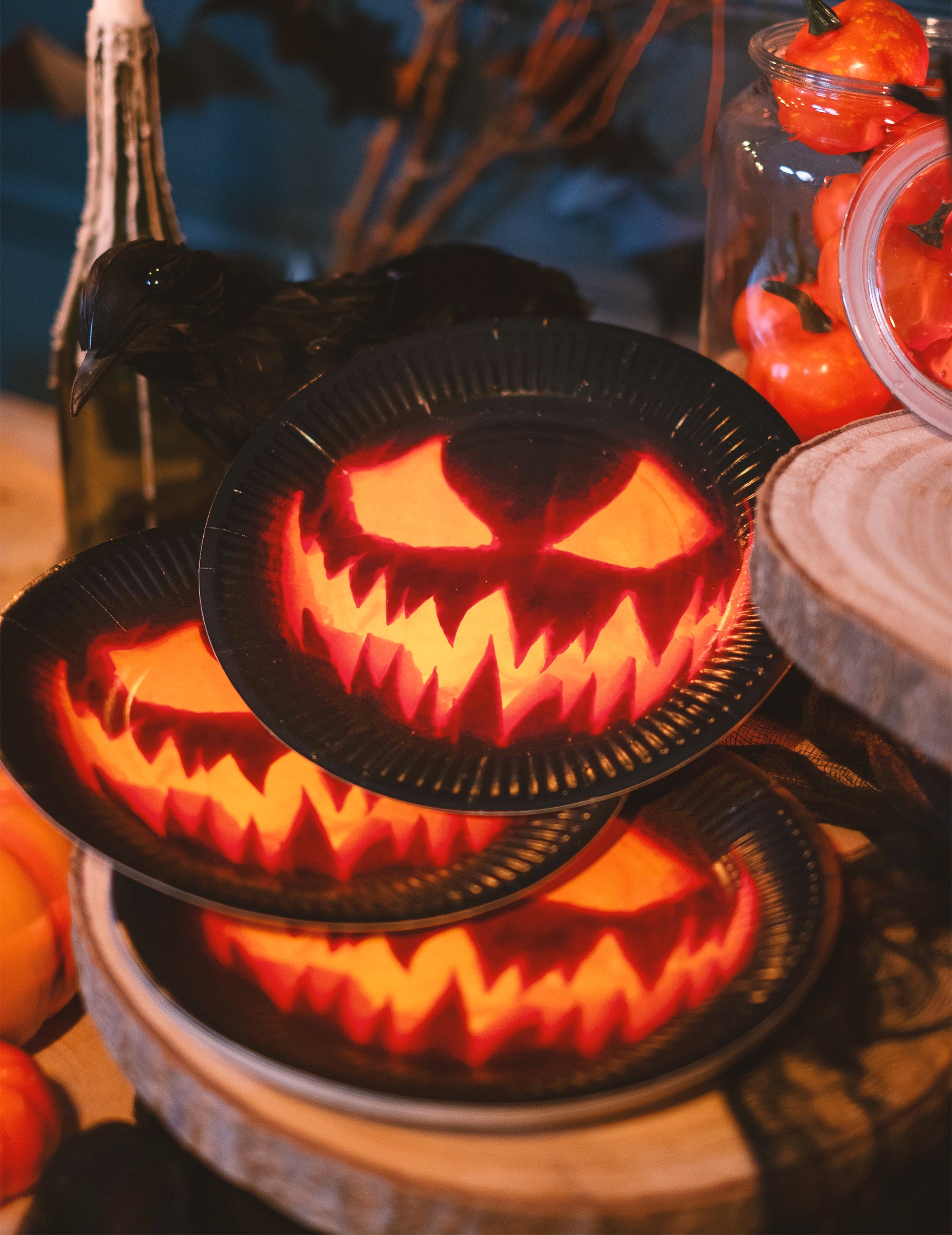 Ez a készlet 10 félelmetes tök eldobható lemezt tartalmaz. Körülbelül 23 cm -t mérnek. Ezek a kerek lemezek feketeek. Szörnyű gonosz tök képével látják el őket. Ezek a félelmetes töklemezek ideálisak az asztal díszítéséhez Halloween alatt.