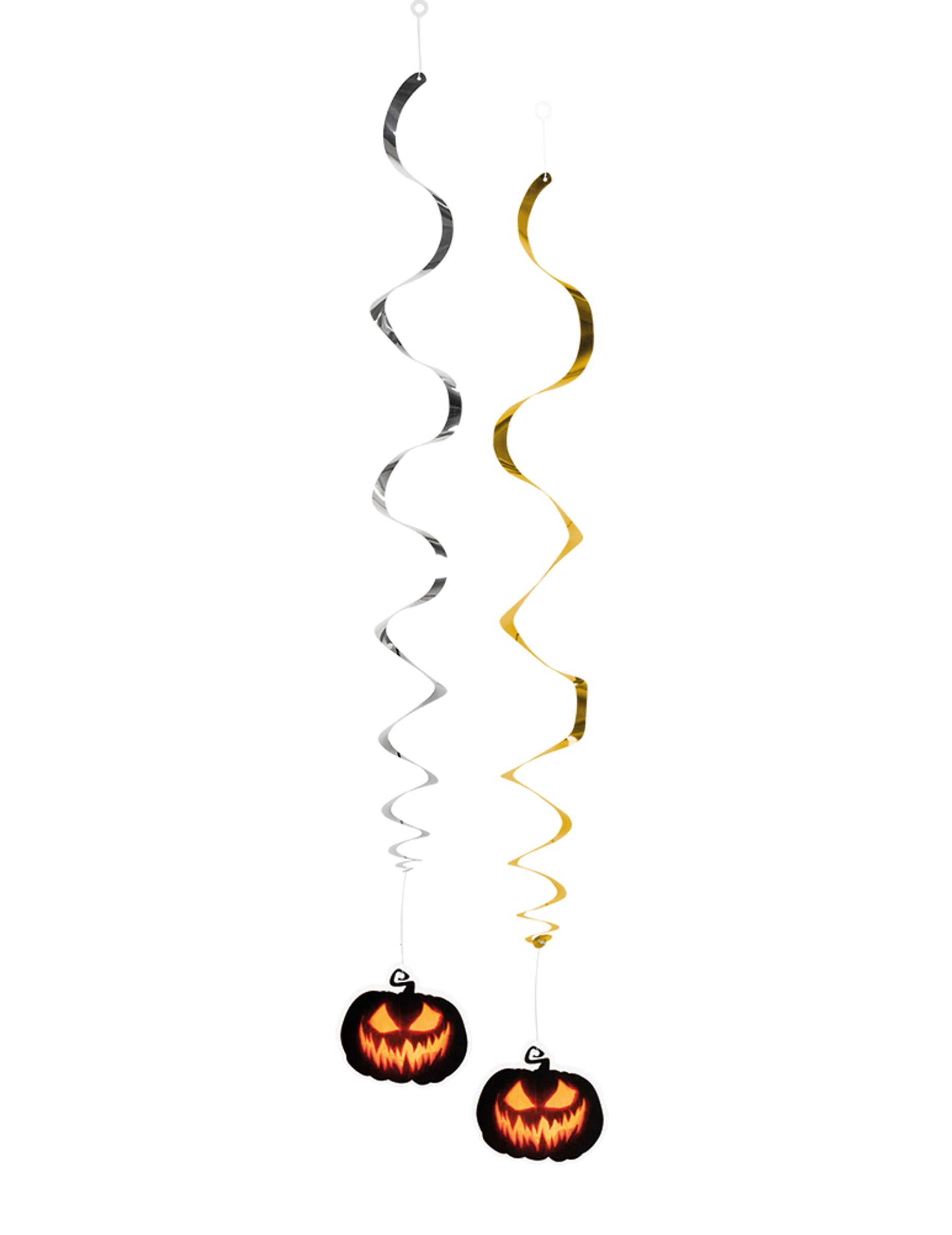 Ez a csomag 2 félelmetes tök felfüggesztésből áll. Körülbelül 85 cm -t mérnek. Ezeket a spirális szuszpenziókat karton matricával látják el. Ez egy fekete démoni tök képe. Ezek a sütőtök függő dekorációk tökéletesek a Halloween dekorációjának kitöltéséhez.