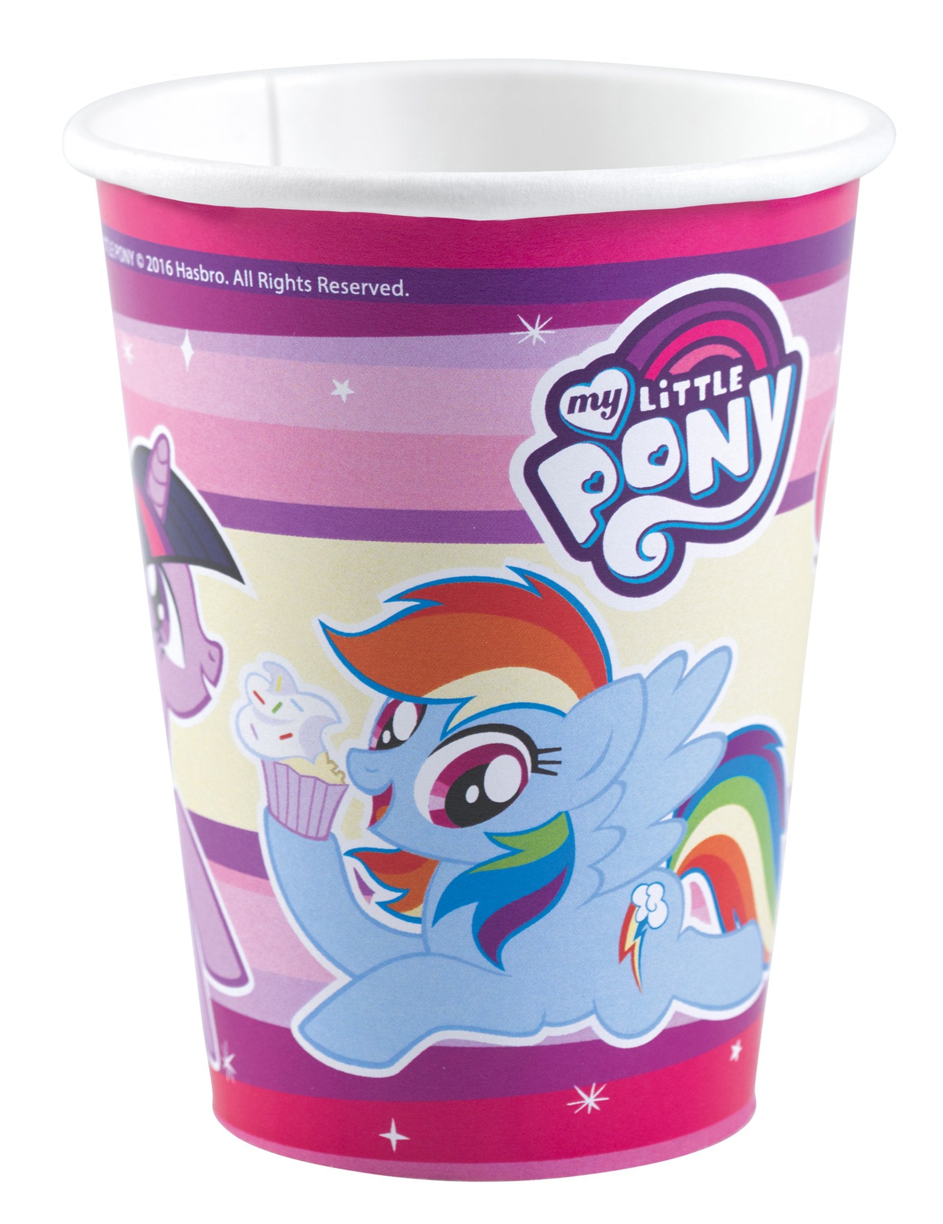 A 8 póni kartonpoharam hivatalos engedély alá tartozik. Kartonból készülnek, kb. 250 ml kapacitással rendelkeznek, és többszínű nyomtatással rendelkeznek, amely Poneyville híres póniát ábrázolja. Ez a 8 kis póni kartonpoharam nem fogja eleget tenni a sorozat és a film kis rajongóinak, ha asztali dekorációt kínálnak a születésnapi snackükhöz. Ez a Rainbow Dash és a Twilight Sparkle segítségével.
