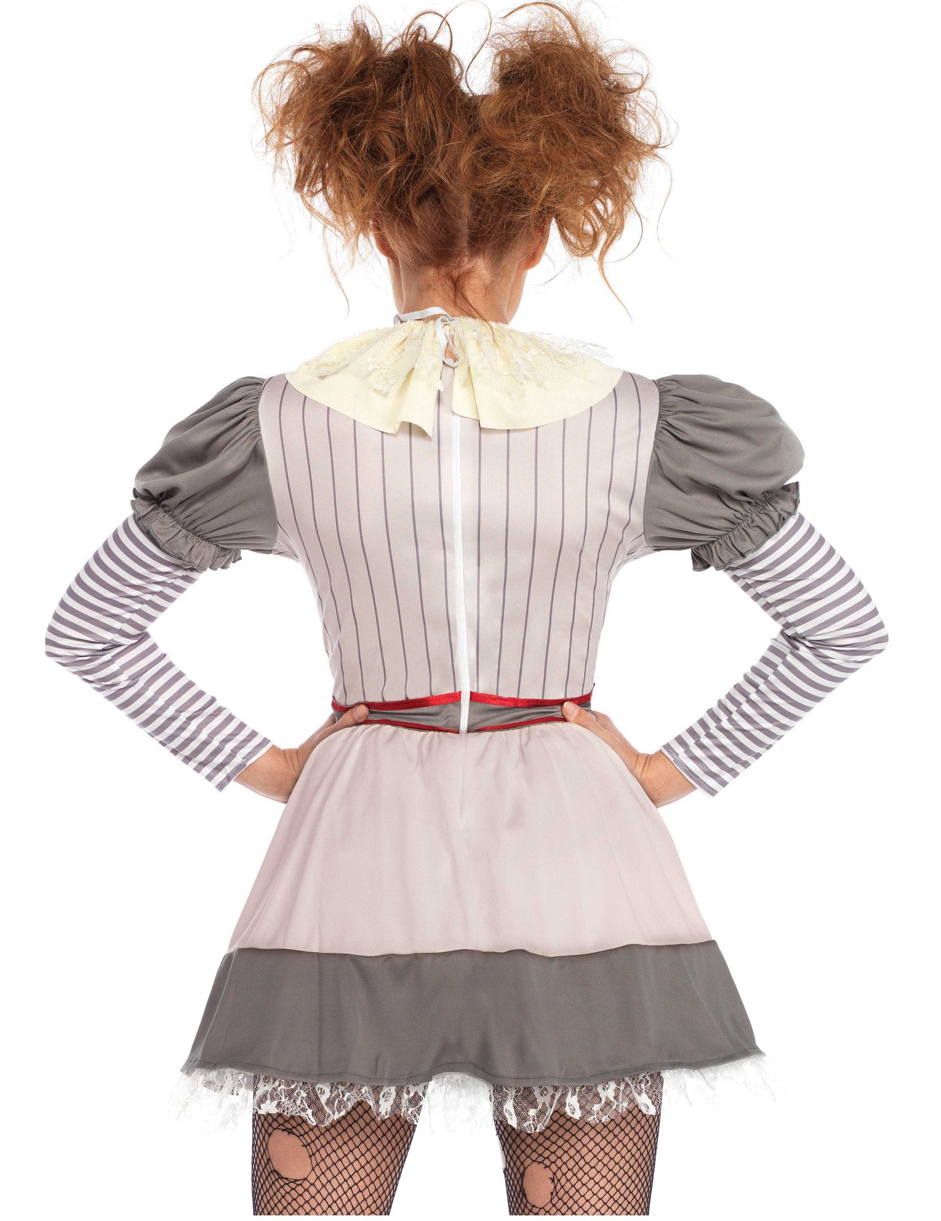 Ennek a hátborzongató bohóc hátborzongató jelmeznek van egy ruhája és hamis átadása. A rövid ruhában szürke és fehér csíkos és fehér színű ujjú, rövid szürke puffasztó hüvelyekkel vannak bélelt. A ruha többi része fehér, a tetején finom ryures. A szürke öv utánzata alapján ívelt, és a törzsen egy sor pompom van a minőségi kivitel érdekében. A hamis, fehér színű gallér a gonosz bohóc álruhájának hozzáféréséhez jön. Ez a hátborzongató bohóc jelmez ideális lesz a terror elindításához a Halloween estén.