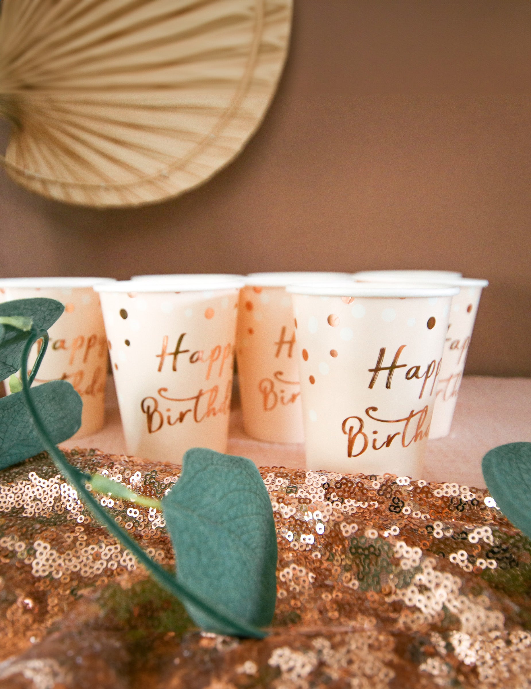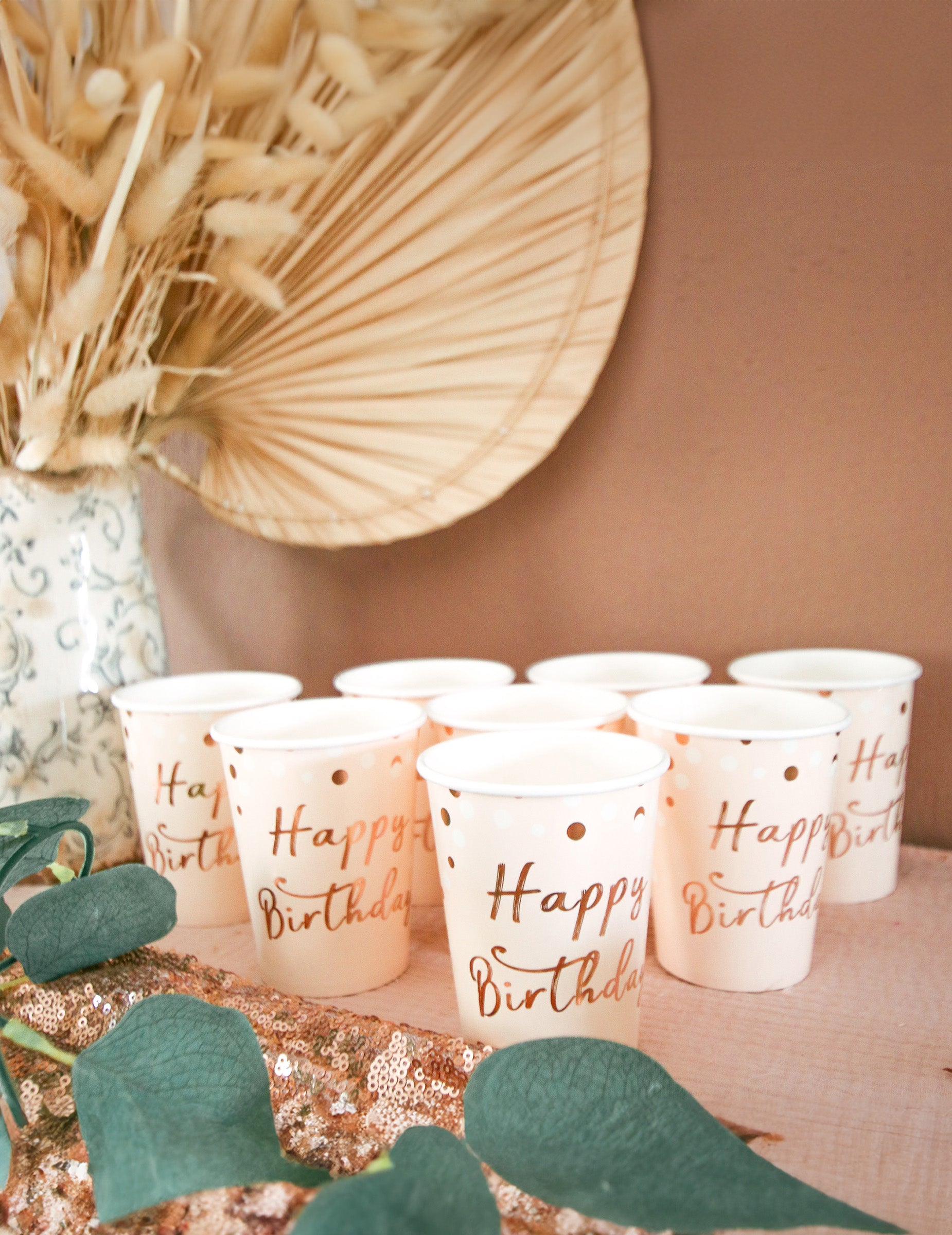 Ezeket a csészéket nagyon 8 -ban értékesítik. Világos rózsaszín színű, ezeket a csészéket borsó díszíti és a "Boldog születésnapot" felirat díszíti. Kapacitása 255 ml. Töltse ki az asztalát egy arany rózsa fesztiválra ezekkel a kartondobozokkal!