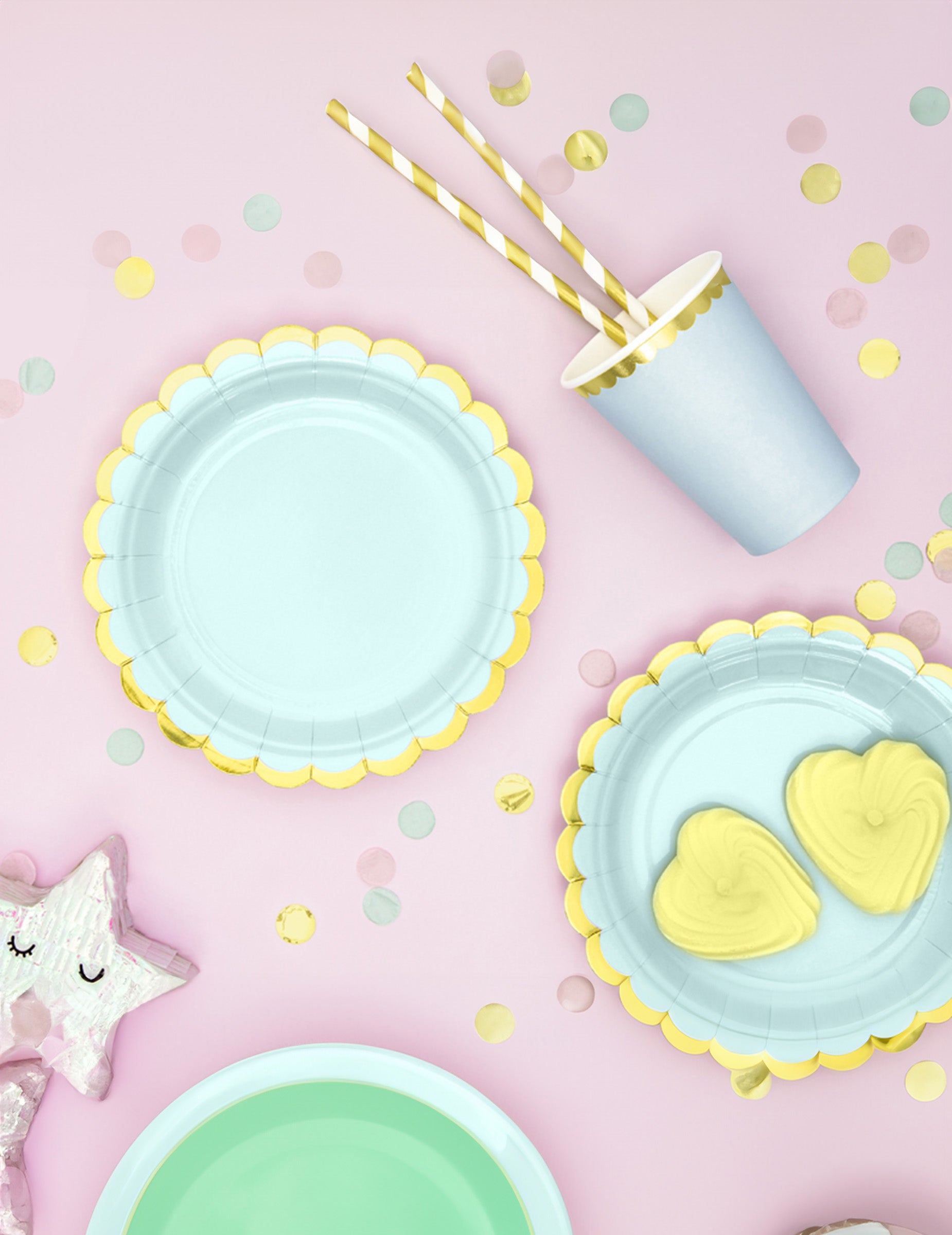 Ez a csomag 6 darabot tartalmaz kis tányérok Eldobható. Ezek desszertes tányérok Kartonból készültek, menta színűek és elegáns arany kagylós szélűek. Átmérőjük körülbelül 18 hüvelyk. cm, ezek kis tányérok Elegáns és modern kialakításuknak köszönhetően tökéletesen alkalmasak tortáid díszítésére...pasztell születésnap vagy bármilyen ünnepi esemény lágy színekkel.