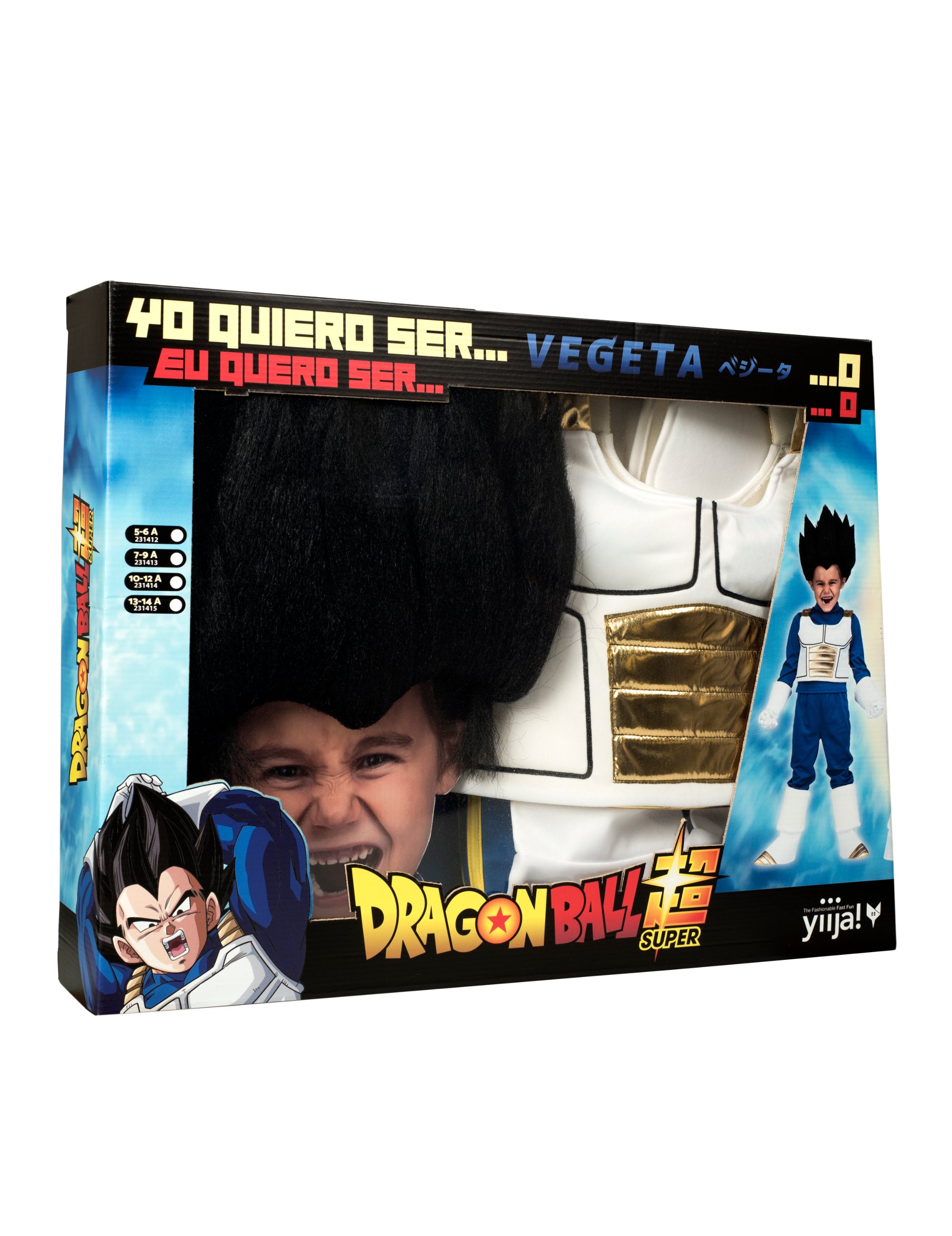 Ennek a Vegeta doboznak teljes jelmeze van. Tartalmaz egy parókát, nadrágot, pulóvert, plastont, kesztyűt és csizmát. Az álruhás nadrágot és egy sötétkék pulóvert tartalmaz, amely hasonló a ruhához, amelyet a Vegeta hős hordoz a Dragon Ball Manga -ban. A tetején a pulóver hozzáadódik egy fehér és arany plastronhoz, amely megegyezik a Space Warrioréval. Fehér kesztyű és csizma jön a Vegeta jelmez hozzáféréséhez, hogy ez nagyon valósághű legyen. És a befejezéshez egy poliészter parókát talál, amely utánozza a Vegeta hajat. Fekete, a hajszálak függőlegesen a manga hős fején. Ez a Vegeta jelmez hivatalos licenc alatt van a Dragon Ball Z alatt, ideális lesz egy cosplay rendezvényhez, egy este a manga vagy a karnevál témájára álcázva!