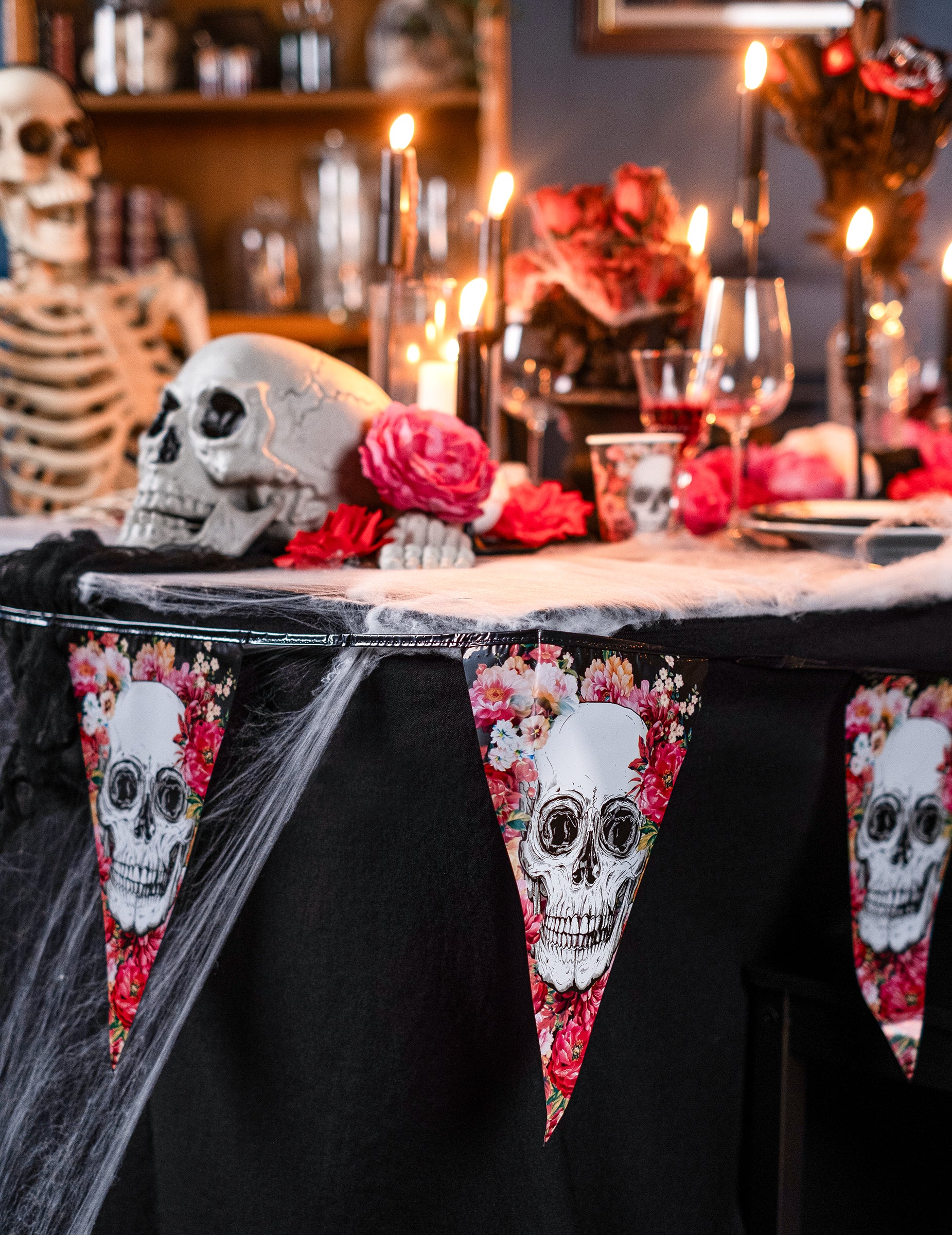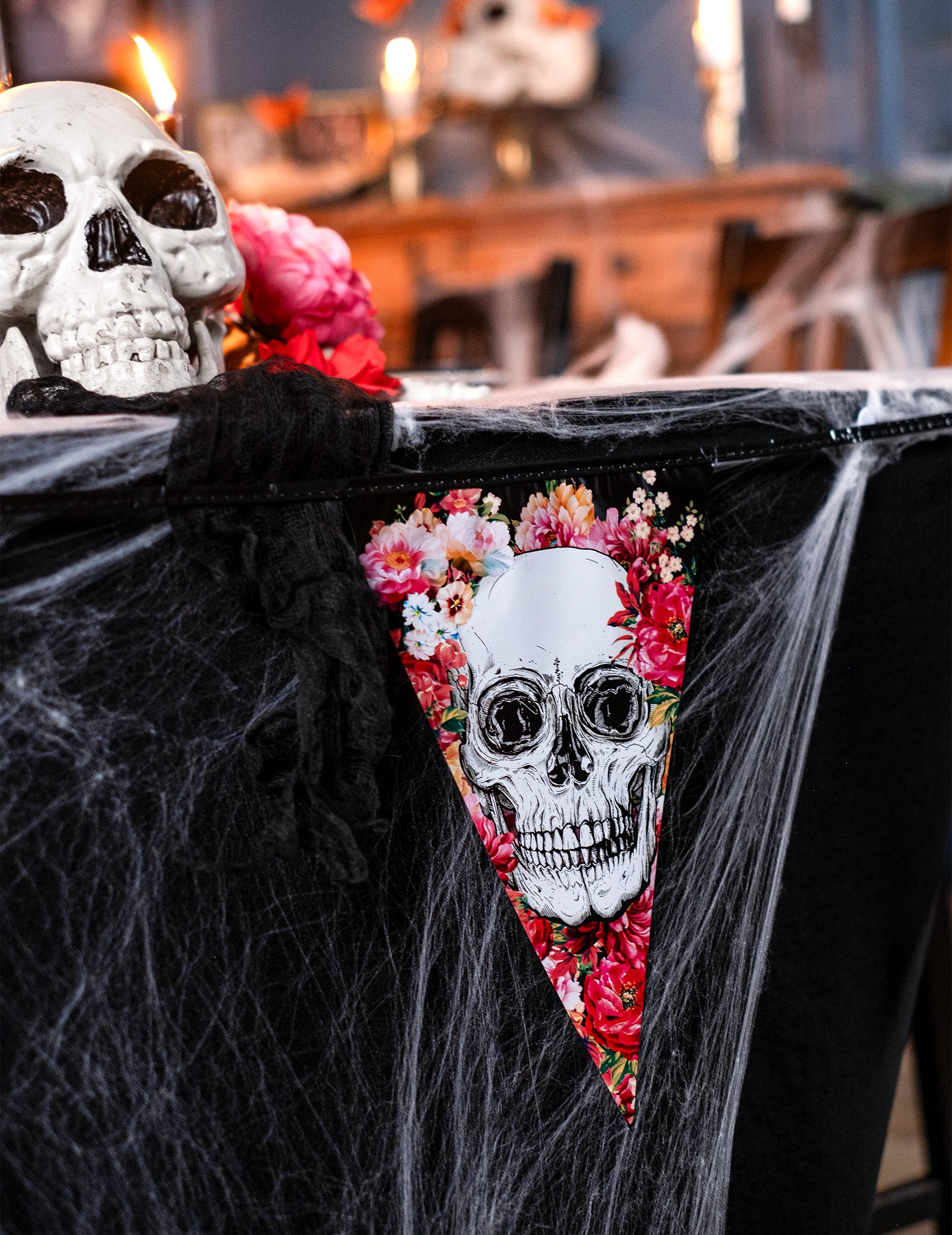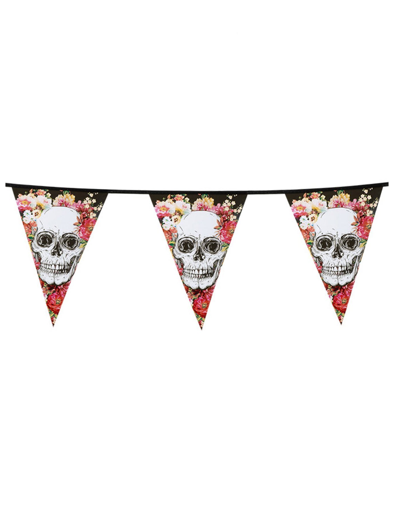 Ez a terv, hogy Garland műanyagból készül. Körülbelül 6 m hosszú, és a zászlók körülbelül 30 cm magas. Fekete, csontváz koponyákkal, rózsaszín virágokkal körülvéve. Ez a Garland tökéletes lesz a Halloween szobájának díszítéséhez!