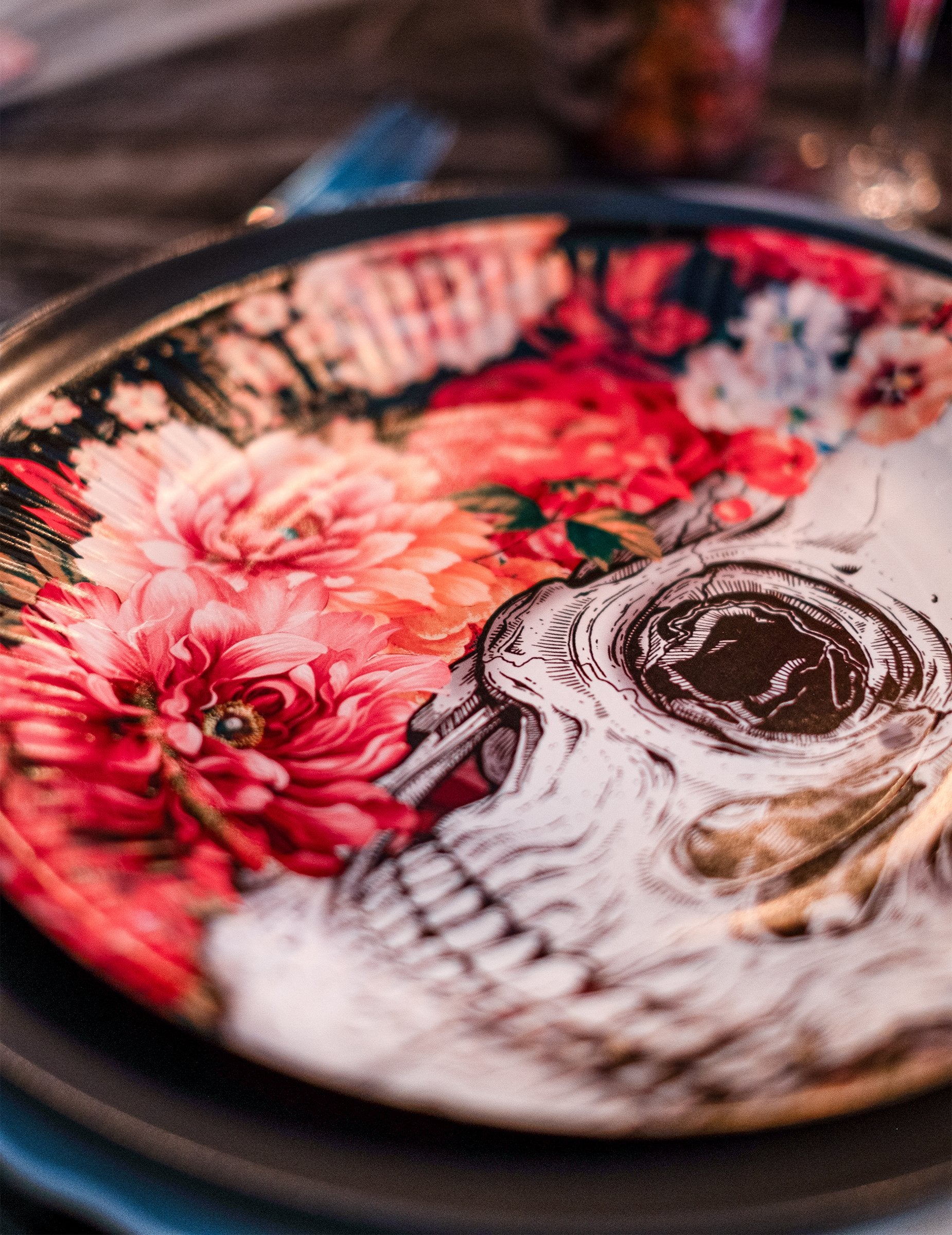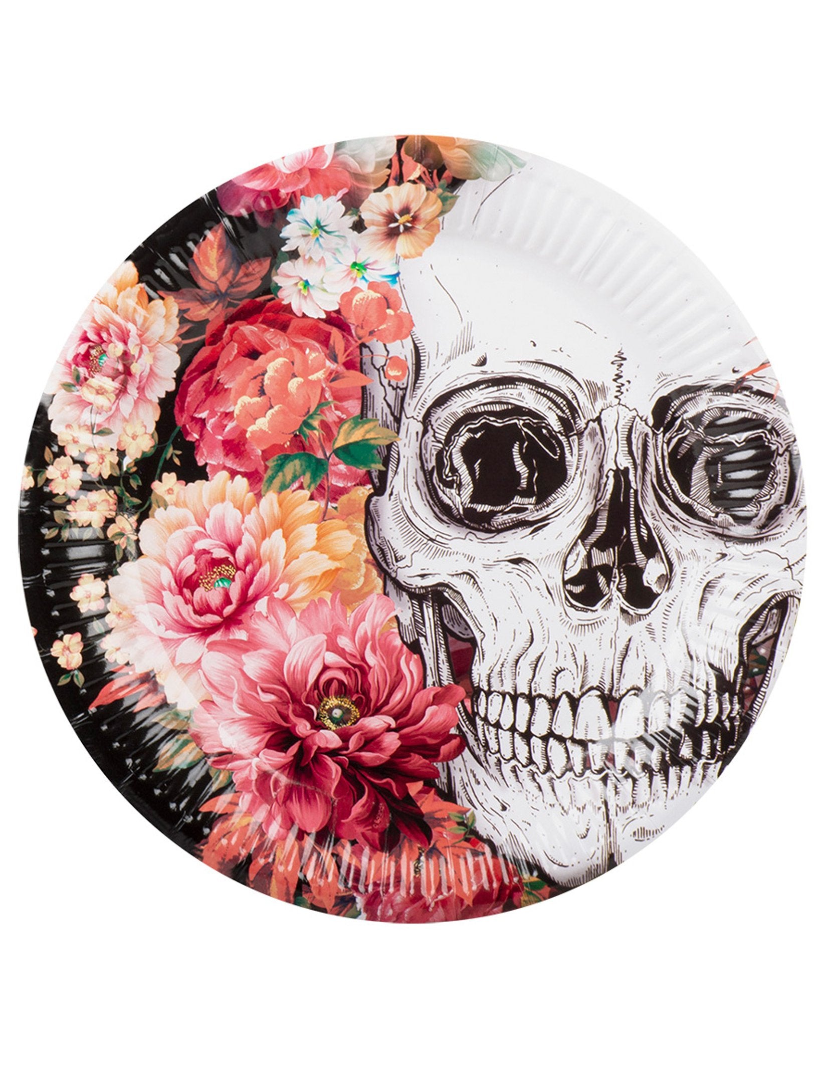 Ez a tétel 10 kartonlemezt tartalmaz. Átmérője körülbelül 23 cm. Nagyon virágos, csontváz koponyával díszítve. Ezek az eldobható lemezek tökéletesen elkészítik a Halloween táblázatot!