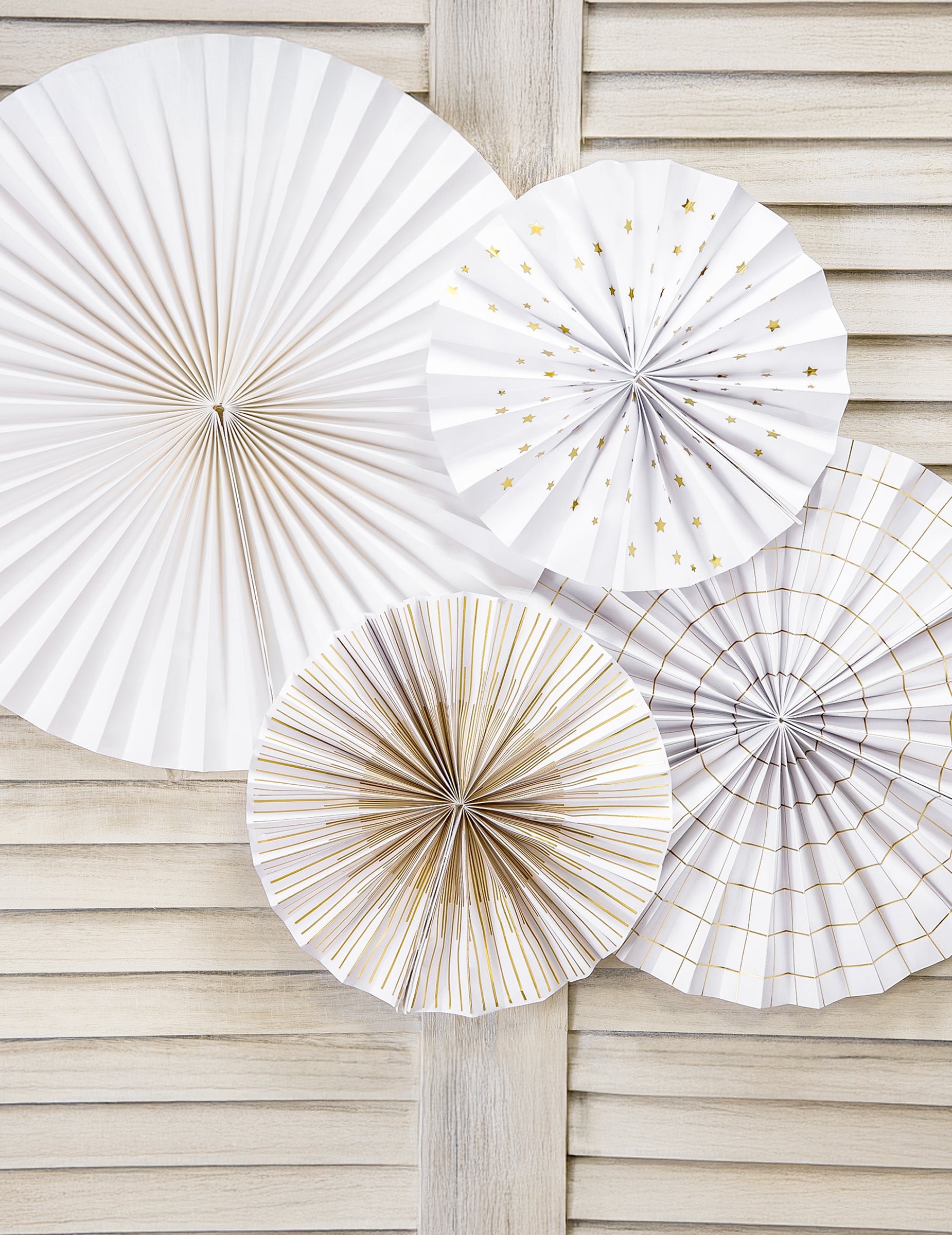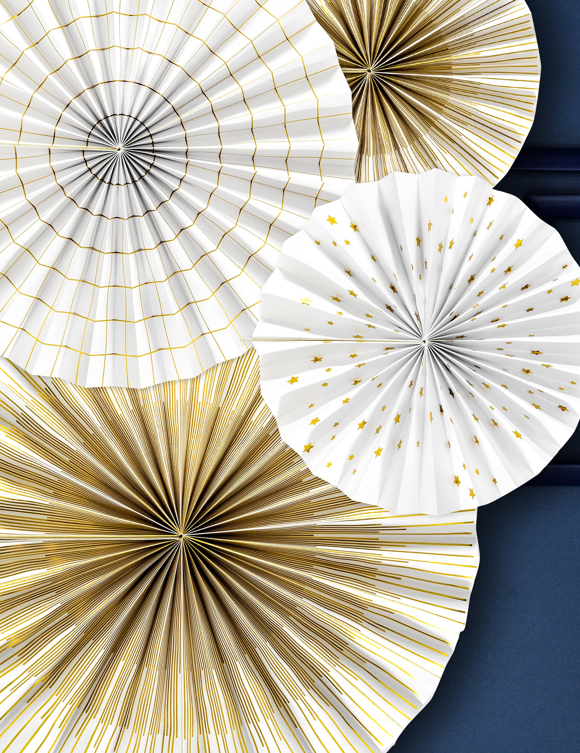 Ez a tétel 4 dekoratív rozettát tartalmaz. Aranyok és fehérek, és karcolásokkal, valamint borsóval vannak díszítve. Díszítheti szobáját ezekkel a rozettákkal születésnapon, esküvőn vagy az újévben!