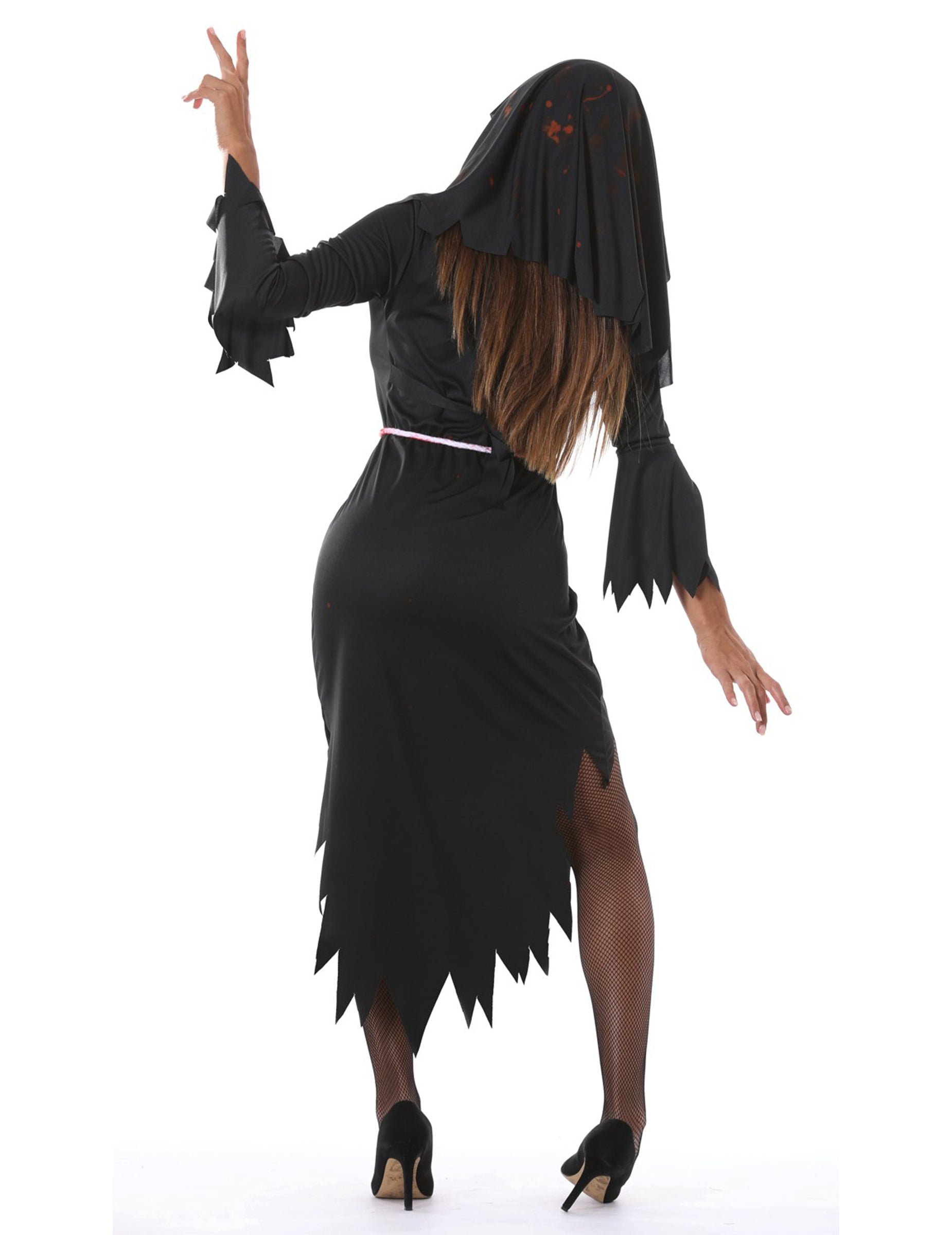 Ez a gonosz apáca álruhája ruhából, sapkából és övből áll (harisnyanadrág, cipő és rózsafüzér nem tartozik). A ruha fekete, vérvörös foltokkal. Az ujjak alját és a ruhát a szakadt hatás tippeire vágják. A ruha egy fehérgalléros, hamis vérrel kenve. A fekete -fehér apáca mandzsetta megfelel a ruhának. Az öv fehér zsinór, piros foltokkal, és a derék körül van kötve. Ez a démoni apáca álruhája tökéletes lesz a Halloween estére.