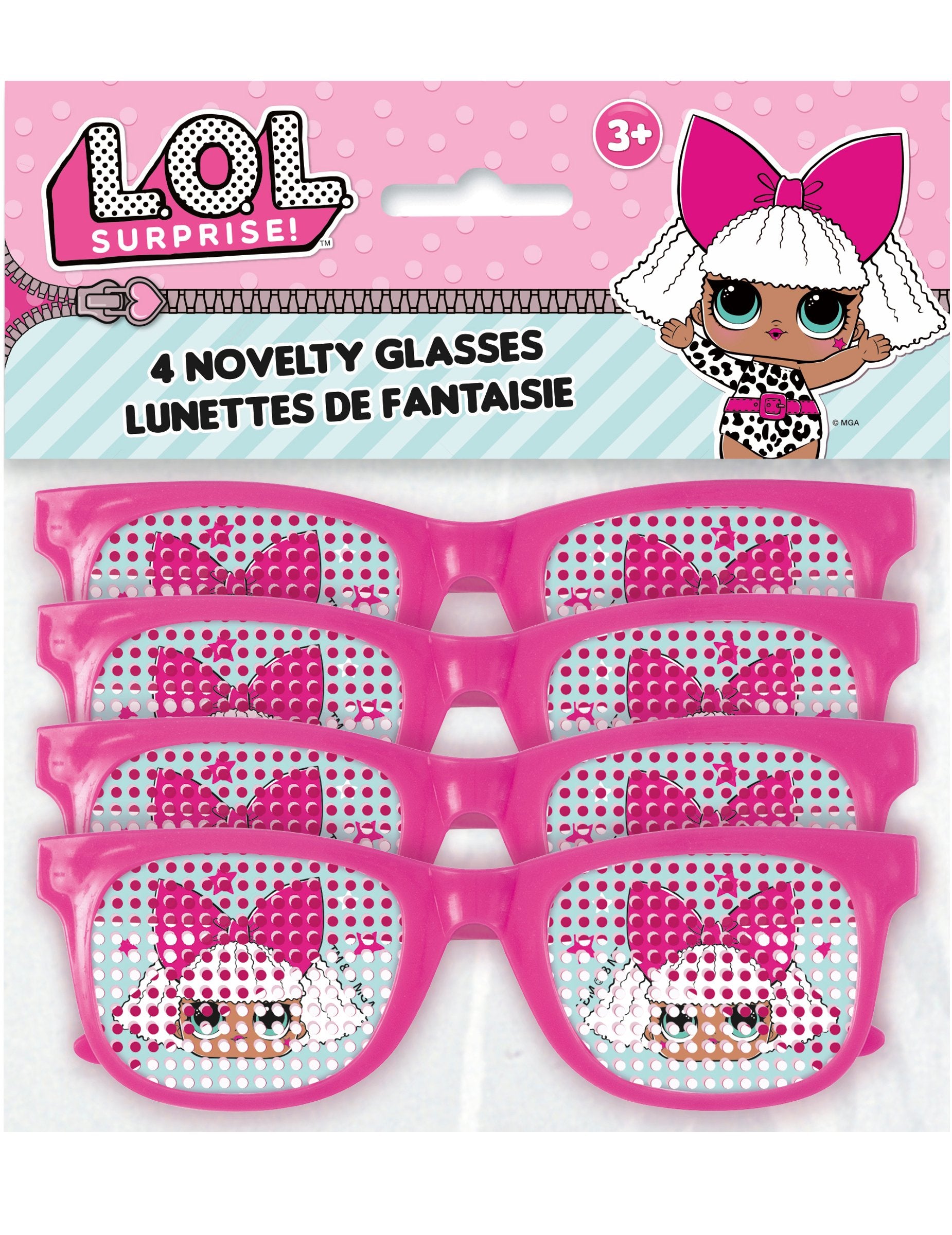 Ezeket a műanyag szemüveget nagyon 4 -ben értékesítik, és hivatalos licenc lol meglepetés alatt állnak. Rózsaszínűek, a meglepetés egyik babájával, amelyet a szemüvegre nyomtattak. A szemüveg helyett egy pontozott lyukas műanyagot talál, amely lehetővé teszi a jó láthatóságot. Ezek a szemüvegek tökéletesek lesznek például a kislányok kedvéért egy születésnapra!