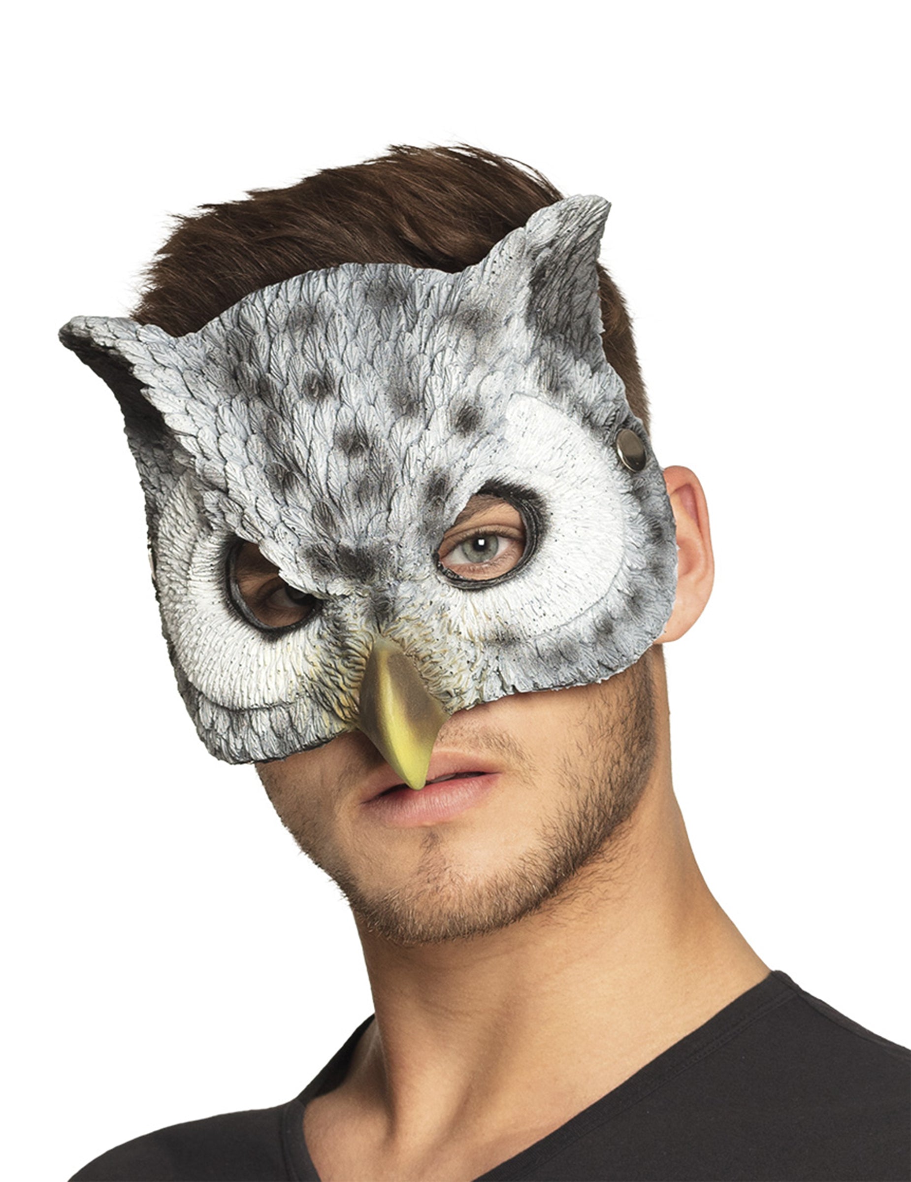 Ez a félmaszk felnőtteknek szól. Ez egy bagoly arcát képviseli, fehér és szürke tollakkal. A fülek és a csőr megkönnyebbültek, hogy növeljék ennek a maszknak a realizmusát! A szemed lyukai nagyon jó láthatóságot biztosítanak. Tökéletes lesz egy esti esti vagy a karneválra álcázott estére!