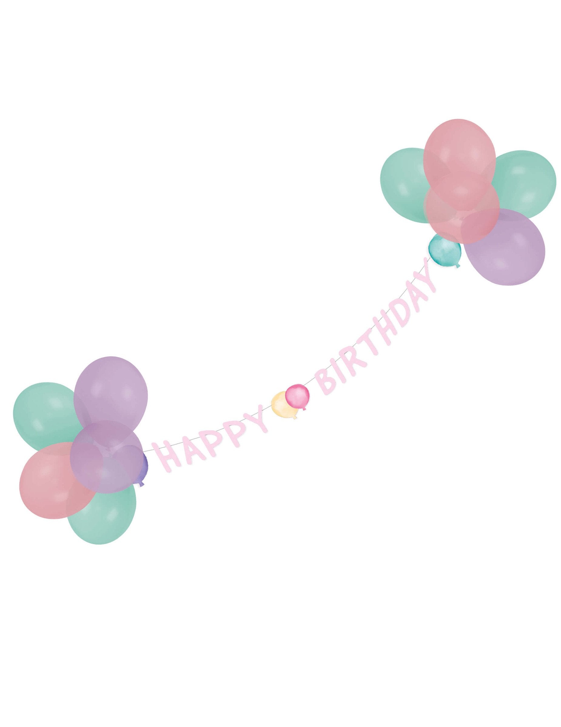 Ennek a koszorúnak mindkét végén 10 léggömb van elosztva. A pasztell léggömbök körülbelül 22,8 cm -t mérnek. A Garland kb. 1,5 méteres mérés, magában foglalja a "Boldog születésnapot" említést, rózsaszínű, színes ballonminták kíséretében. Töltse ki születésnapi dekorációját ezzel a pasztell ballon koszorúval!