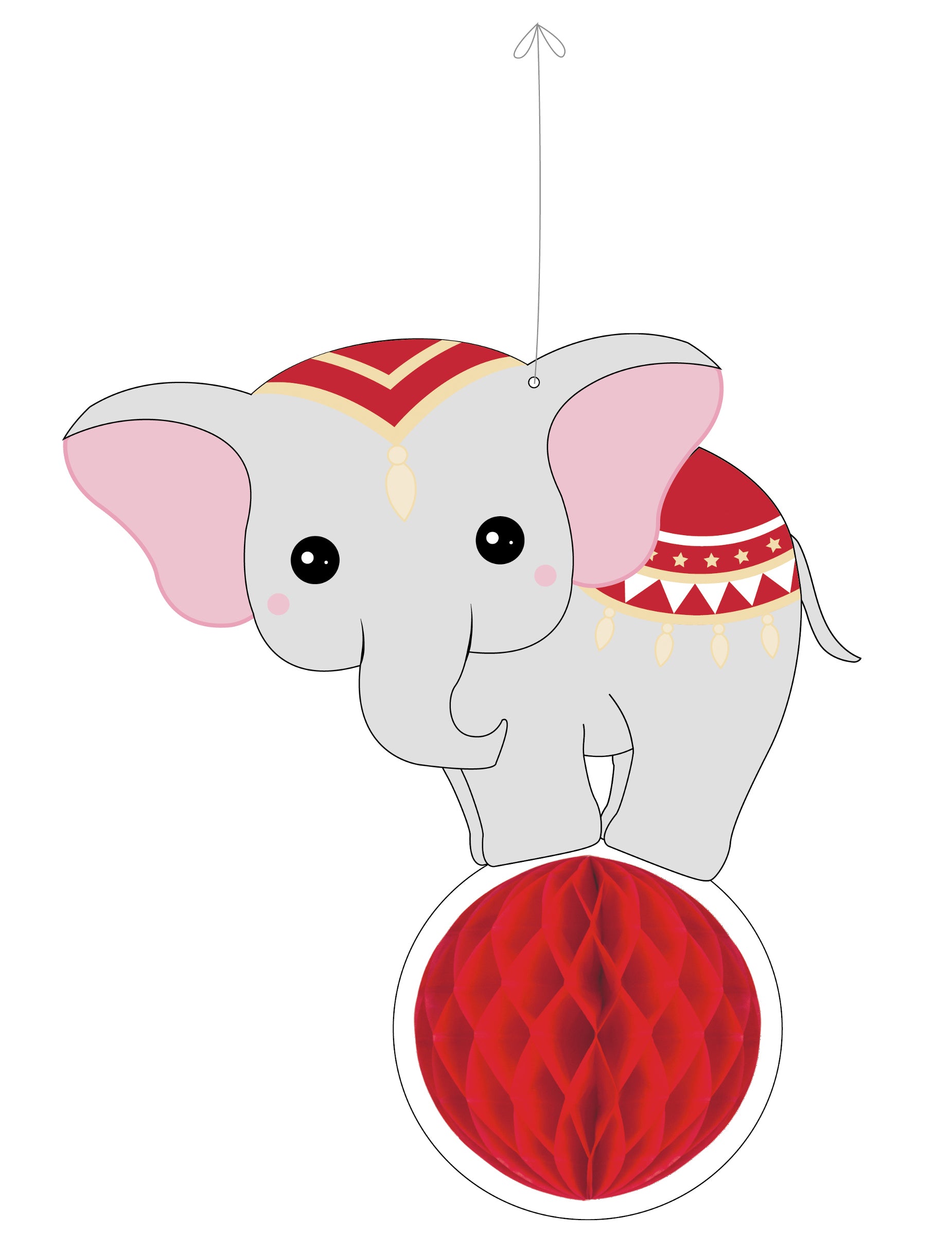 Adj egy csipetnyi varázslatot az eseményednek ezzel felfüggesztés dekoratív, körülbelül 25 cm. Ez a modell egy piros méhsejtpapírból készült gömb alakú szerkezetből áll, amelyen egy kartonból készült illusztráció látható. elefántEz az ideális kiegészítő a szoba dekorációjának teljessé tételéhez egy ünnepi napon. cirkuszi témájú születésnap ennek köszönhetően elefánt függőlámpa eredeti.