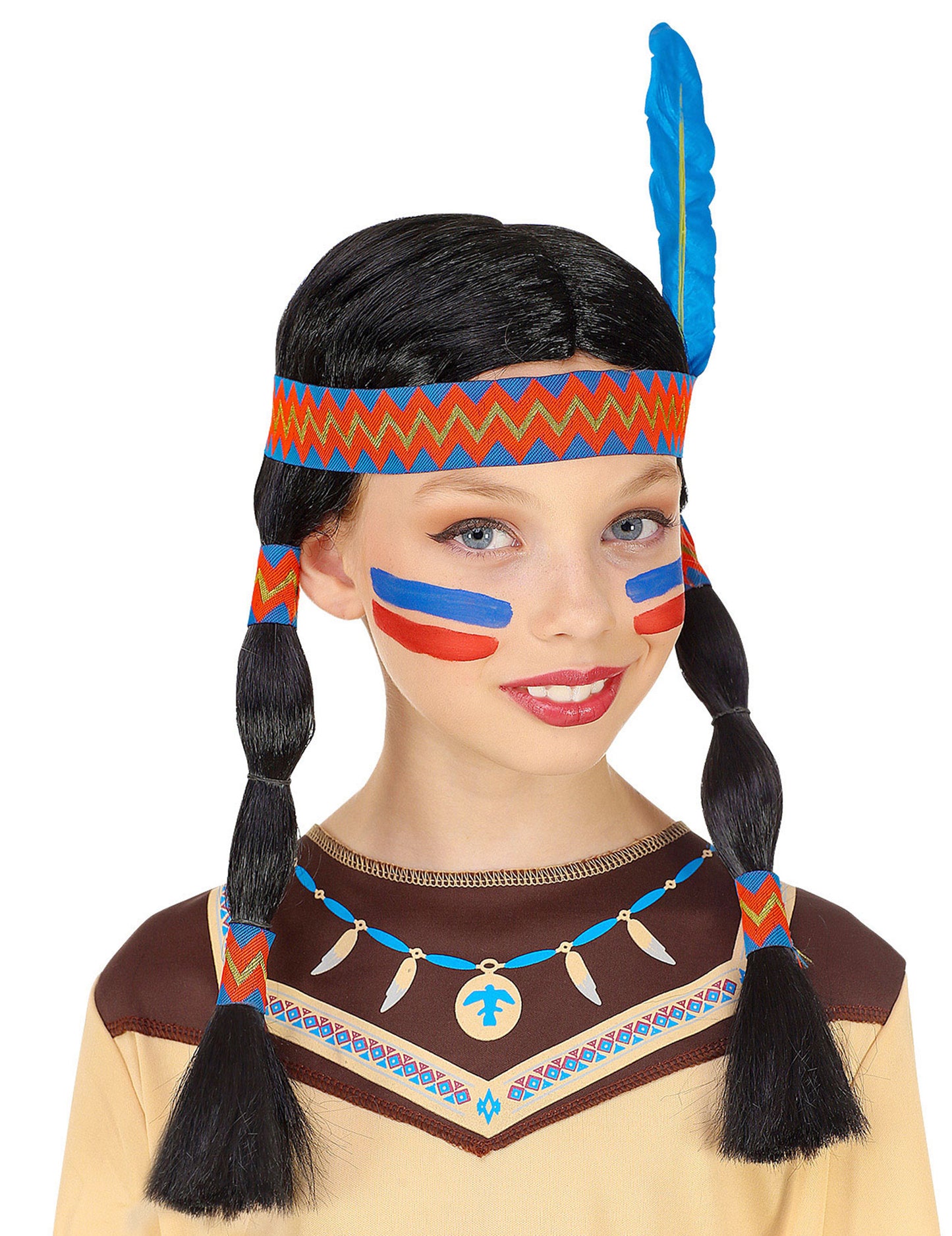 Ez az indiai paróka lánynak szól. Fekete, az arc mindkét oldalán paplan. A paplanokat színes szalagok díszítik. Ezt a parókát egy szalaghirdetés is kiegészíti. Nagyon színes, az oldalán toll van. Ideális kiegészítő lesz a lánya indiai álruhájának befejezéséhez a karneváli napon.