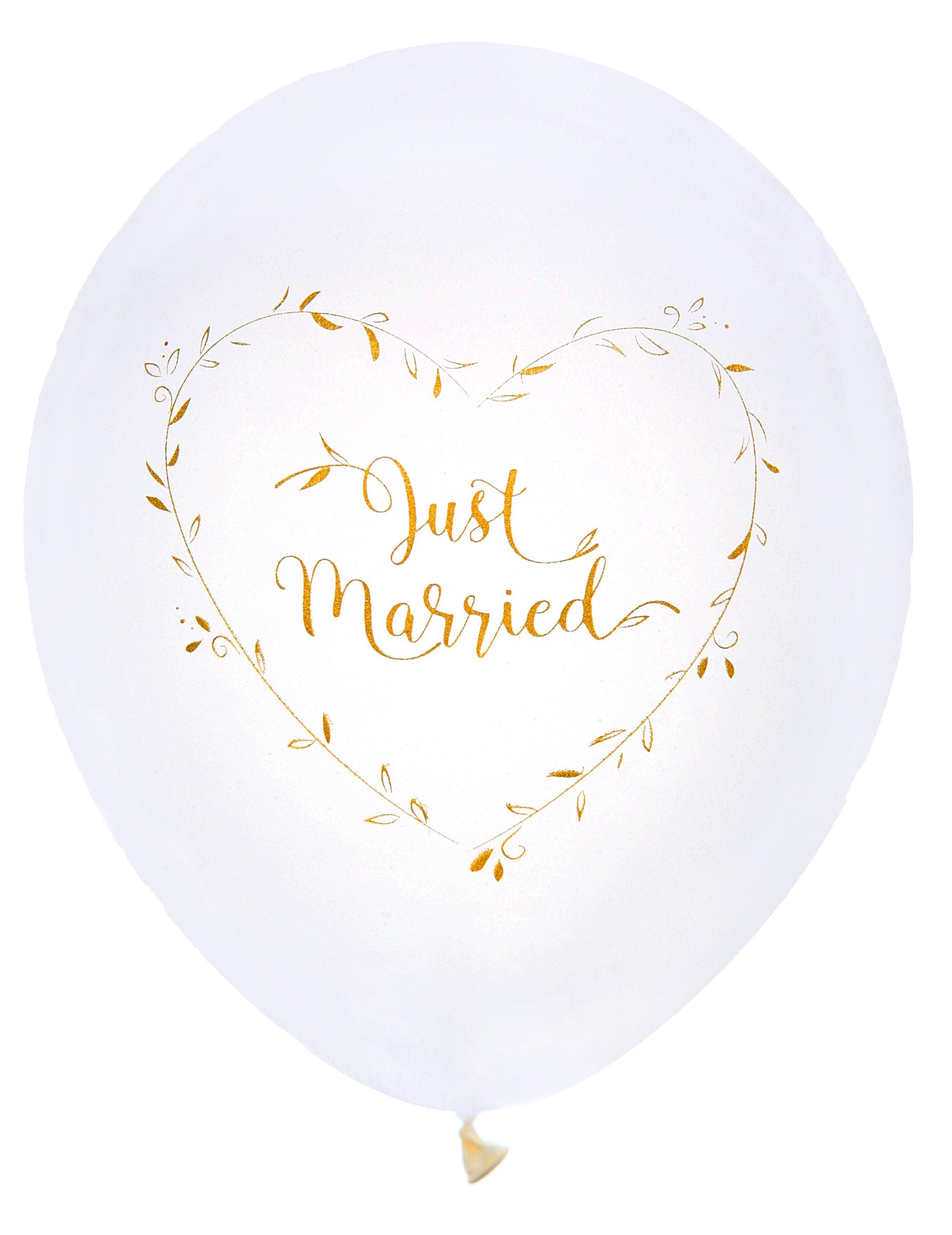 Ezek a fehér kiegészítők az üzenetet közvetítik friss házasok Finoman körülvéve egy virágos szívvel. A minta csillogó arany árnyalata gyönyörűen jelenik meg felfújás közben.