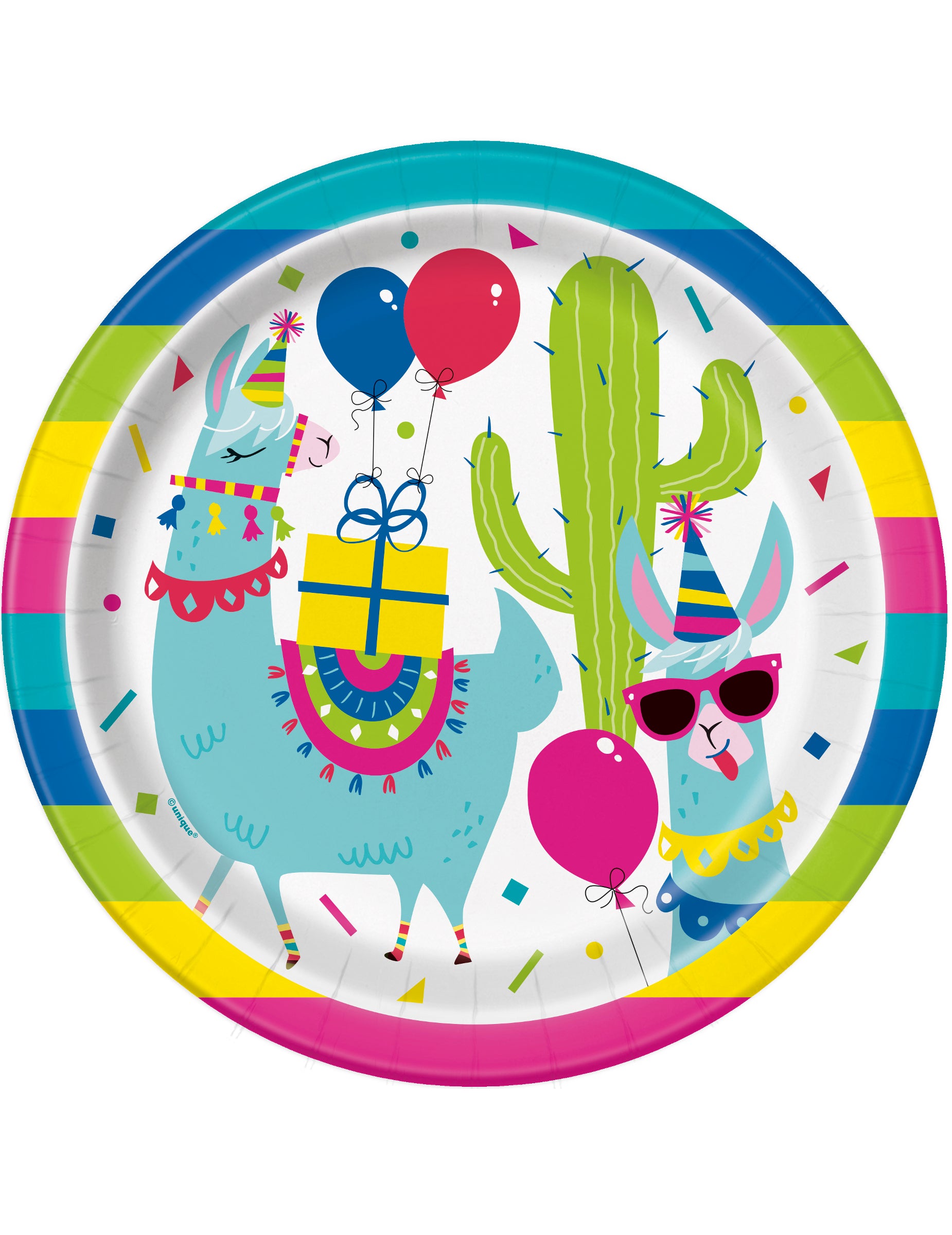 Ez a tétel 8 kartonlemezből áll. Kerek alakú, körülbelül 22 cm átmérőjű. Többszínű csíkos vázlatuk van, a Lamas központja bulizva. Ezek a lemezek tökéletesek lesznek a láma témájú asztali dekoráció kitöltéséhez.