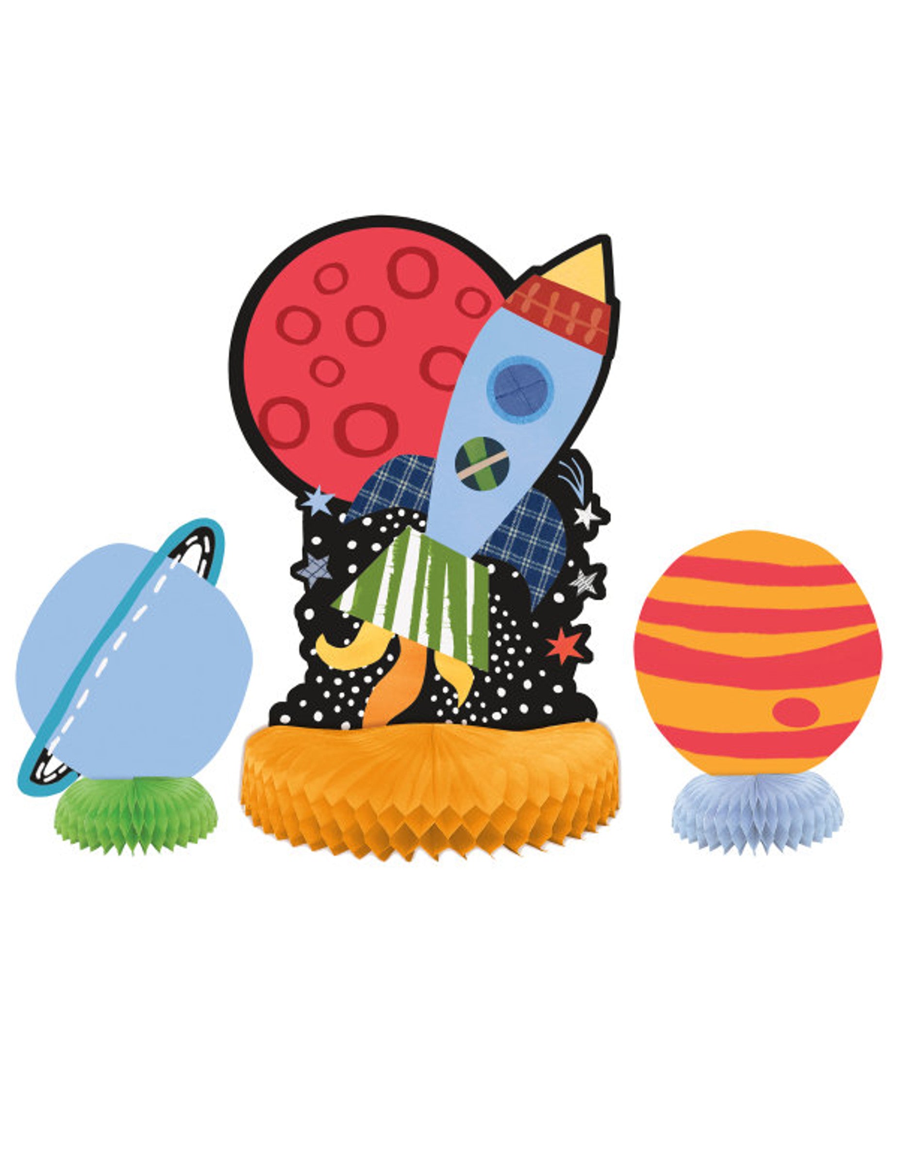 Ez a tétel 3 asztali központot tartalmaz. Ezek kartonból és méhsejt papírból állnak. A legnagyobb mérés körülbelül 35 cm, és egy rakétát és egy bolygót képvisel. A két kicsi körülbelül 15 cm -t mér és bolygókat képvisel. Díszítse az asztalát ezekkel az asztali központokkal az űrben lévő születésnapra!