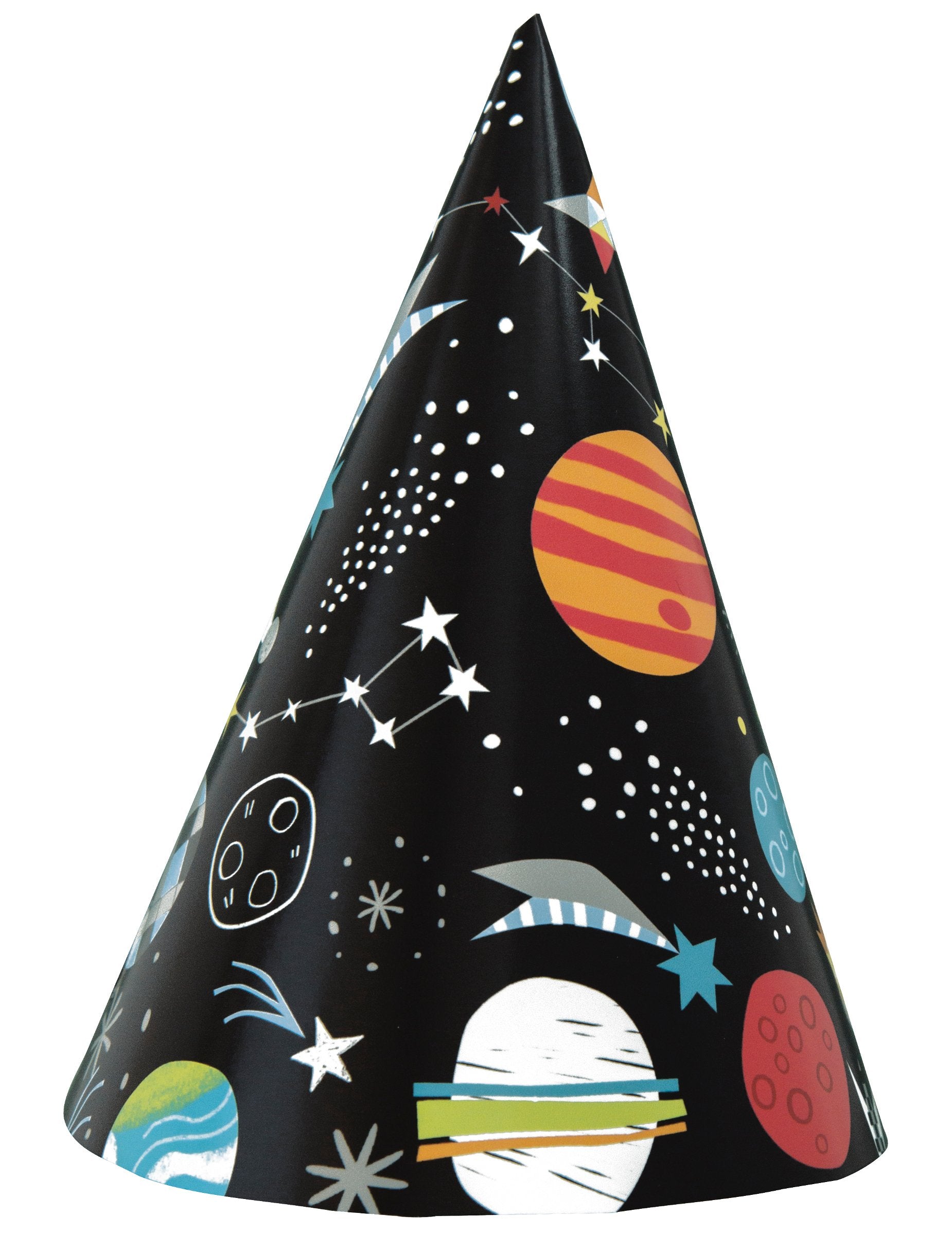 Ezeket a karton ünnepi kalapokat 8 -ban árusítják. Fekete, bolygókkal, csillagokkal és csillagképekkel díszítve. Használja ezeket a parti kalapokat az űr születésnapjának témájához!