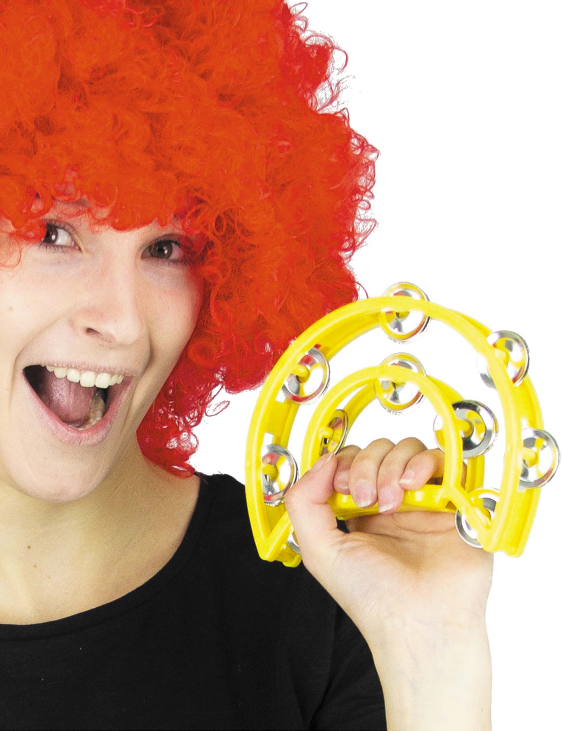 Ez a felnőtt tamburin sárga műanyagból készül. Fel van szerelve cintányérokkal, amelyek mindegyik mozgásában zajt okoznak. Körülbelül 40 cm -t mér. Ez a tamburin tökéletes lesz a bohóc vagy a bohém jelmez befejezéséhez a karnevál számára.