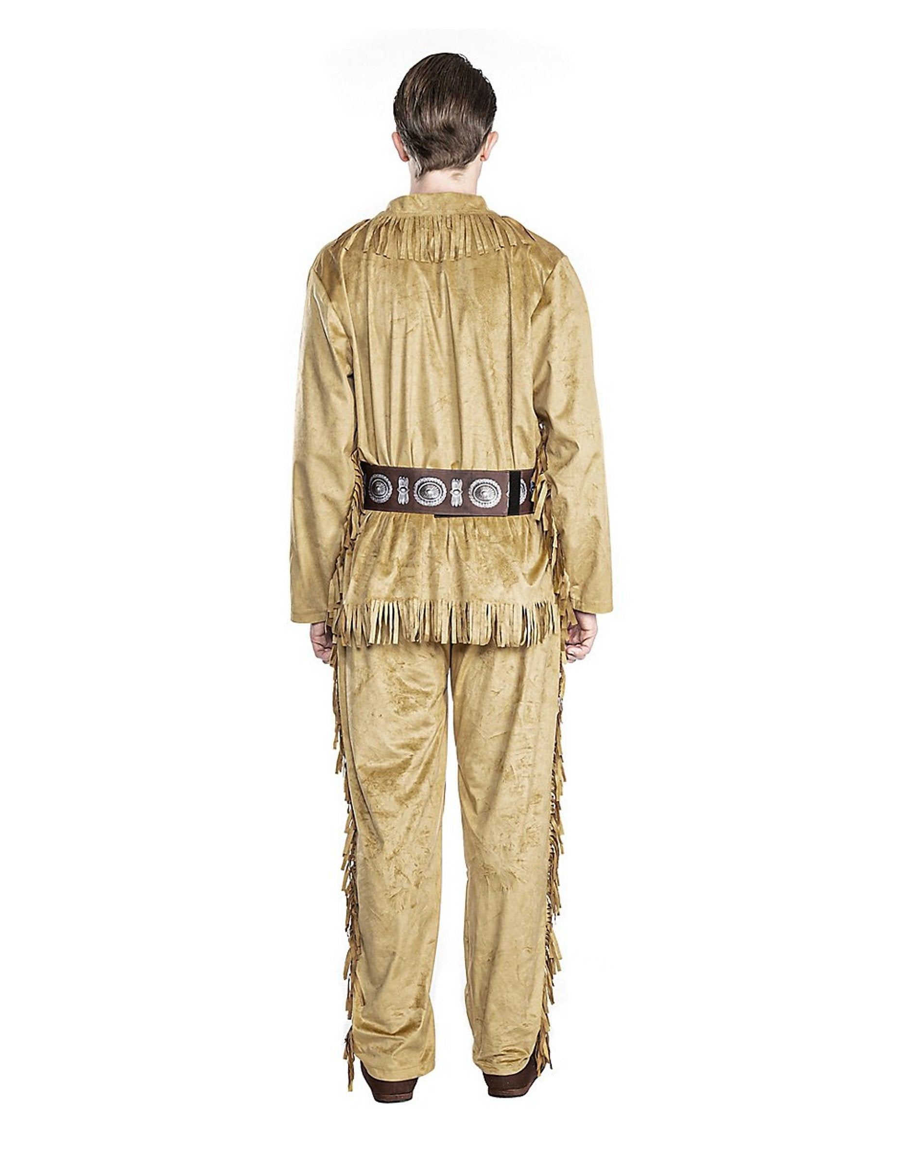 Ez a régi, rázkódásos álruhát egy felső, nadrágból és egy övből áll. A teteje bézs, rojtokkal a galléron és az alján. A központban egy kötés van jelen. Az öv sötétbarna, indiai mintákkal. Karcolásokkal bezárul. A nadrág bézs, amely megfelel a tetejének. Az oldalán rojtokba öltözött. Ez a jelmez tökéletes lesz egy indián megtestesítésére egy nyugati estére.