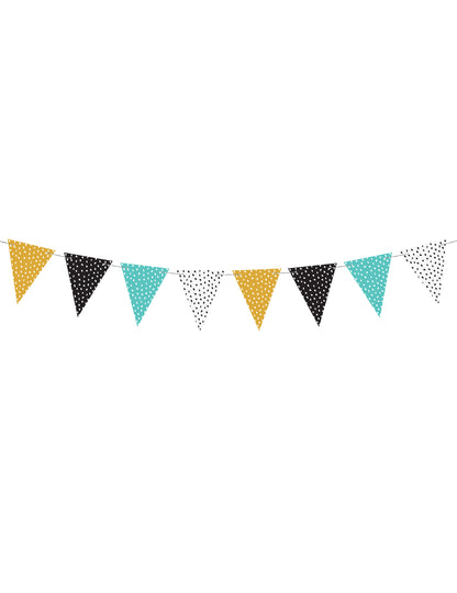 Ez a zászló koszorú kartonból készül. Körülbelül 1,3 méter hosszú és 14 cm magas mérete. A zászlók kék, türkiz, bézs és fehér borsó. Ez a Garland tökéletes lesz a szoba születésnapján történő díszítéséhez!