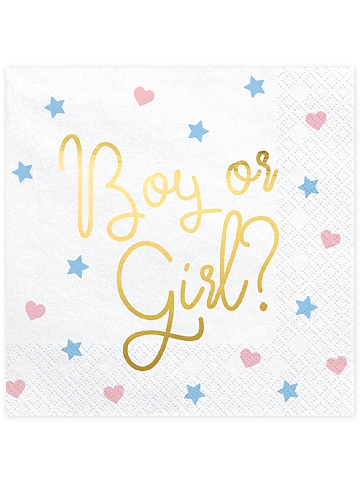 Apportez une touche de mystère à votre événement avec ce paquet de 20 serviettes jetables. De couleur blanche, elles affichent le message « Boy or Girl ? » en lettres dorées, entouré de jolis motifs étoilés bleus et de cœurs roses. Le verso propose un design différent avec un cœur « Girl » ou une étoile « Boy ». Une fois ouvertes, ces décorations de table affichent des dimensions de 33 x 33 cm. Ces serviettes sont parfaites pour animer la révélation du genre lors d'une baby shower conviviale.