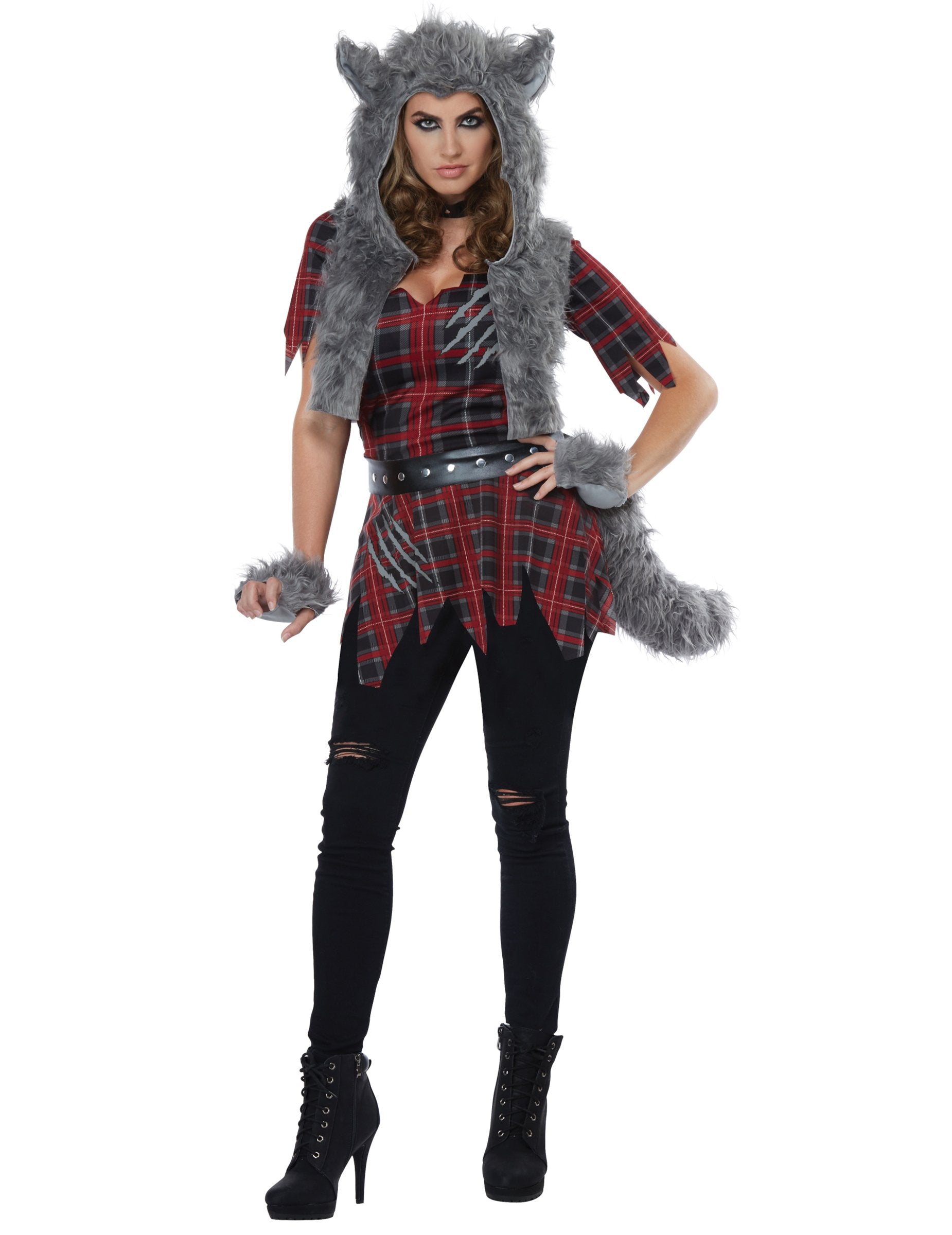 Ez a nők számára készült farkas álruhát tunikából, motorháztetőből, egy pár ujjatlan és egy hozzá rögzített farkú övből (nadrág és cipő nem tartozik). A vörös és a fekete kockás tunikát az alján és az ujjak végén vágják ki. Egy rövid filé szürke műszőrme és egy farkasfülkével ellátott motorháztető kiegészíti a ruhát. Akkor talál egy övet, amelyen egy farkasfarkat varrnak szürke műszőrme. Végül, a szőrme ujjatlan kesztyűje lesz, hogy finomítsa ezt a farkas álruhát még valódi megjelenés érdekében. A tökéletes jelmez a Halloween megünneplésére a barátaiddal!