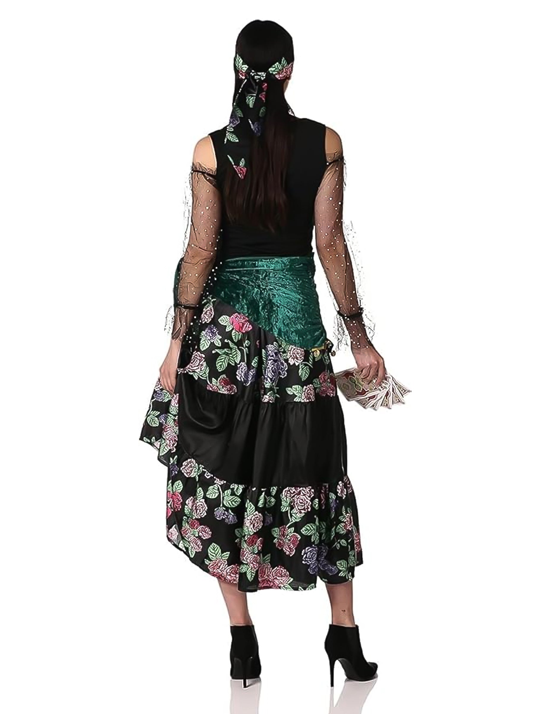 Ez a LED -es jelmez a nők számára fűzővel, szoknyával, övből, fejpánttal és 6 taro -kártyával rendelkező ingből áll. (Kristálygömb, nyaklánc és cipő nem tartalmazza). Az ing fekete, átlátszó, hosszú ujjú és lila fűzővel, narancssárga kötéssel. Az öv zöld, arany érmék alakú dekorációval. Ez beállítja a méretét, és hozzáadja a fekete szoknyát a rózsa mintájával. A fekete szalaghirdetés emlékeztet a szoknya rózsa mintájára. A 6 Tarot kártya hozza egy jó kalandállapot ezen aspektusát. Ez a jelmez tökéletes lesz arra, hogy egy látó cipőjébe tegye a Halloween -be.