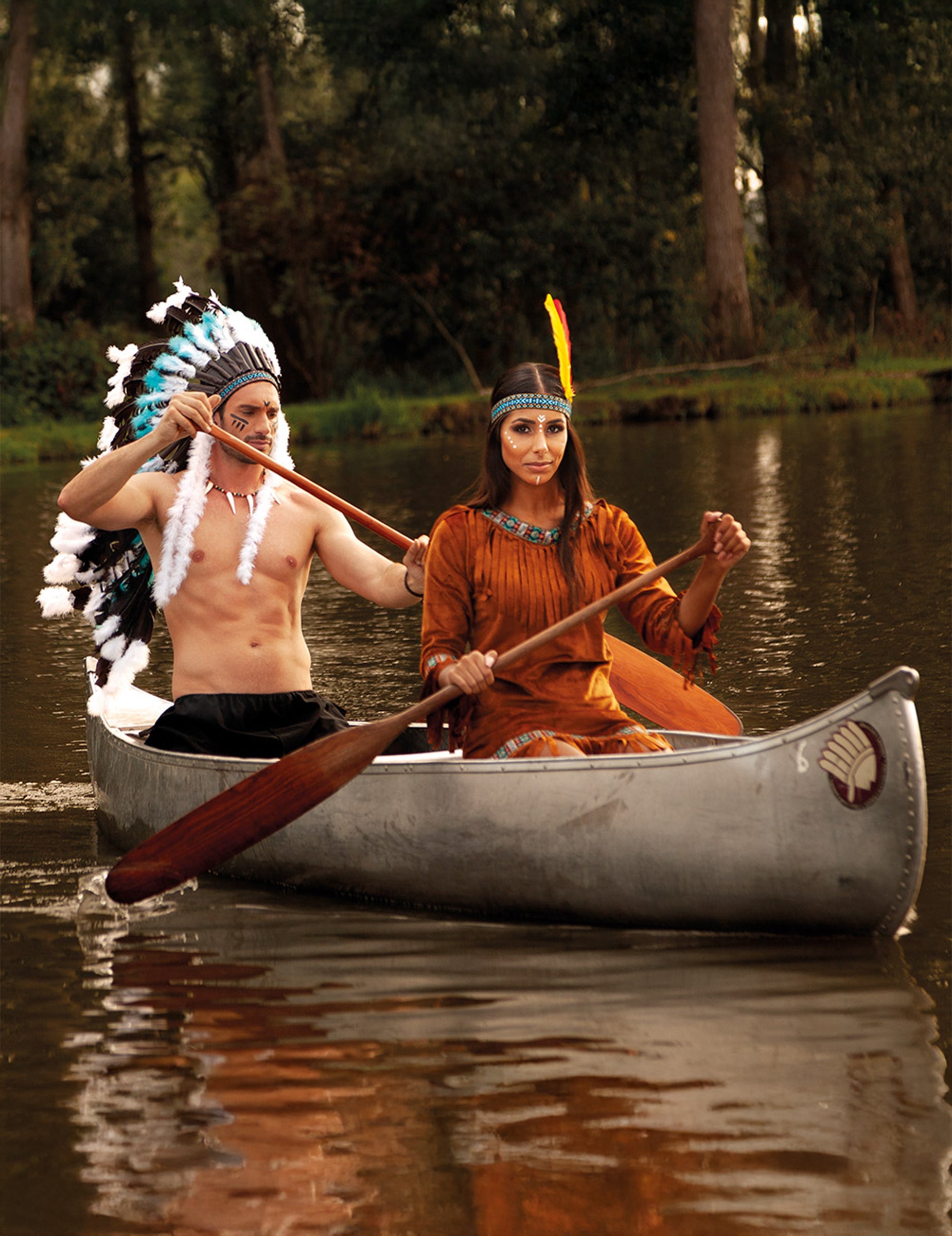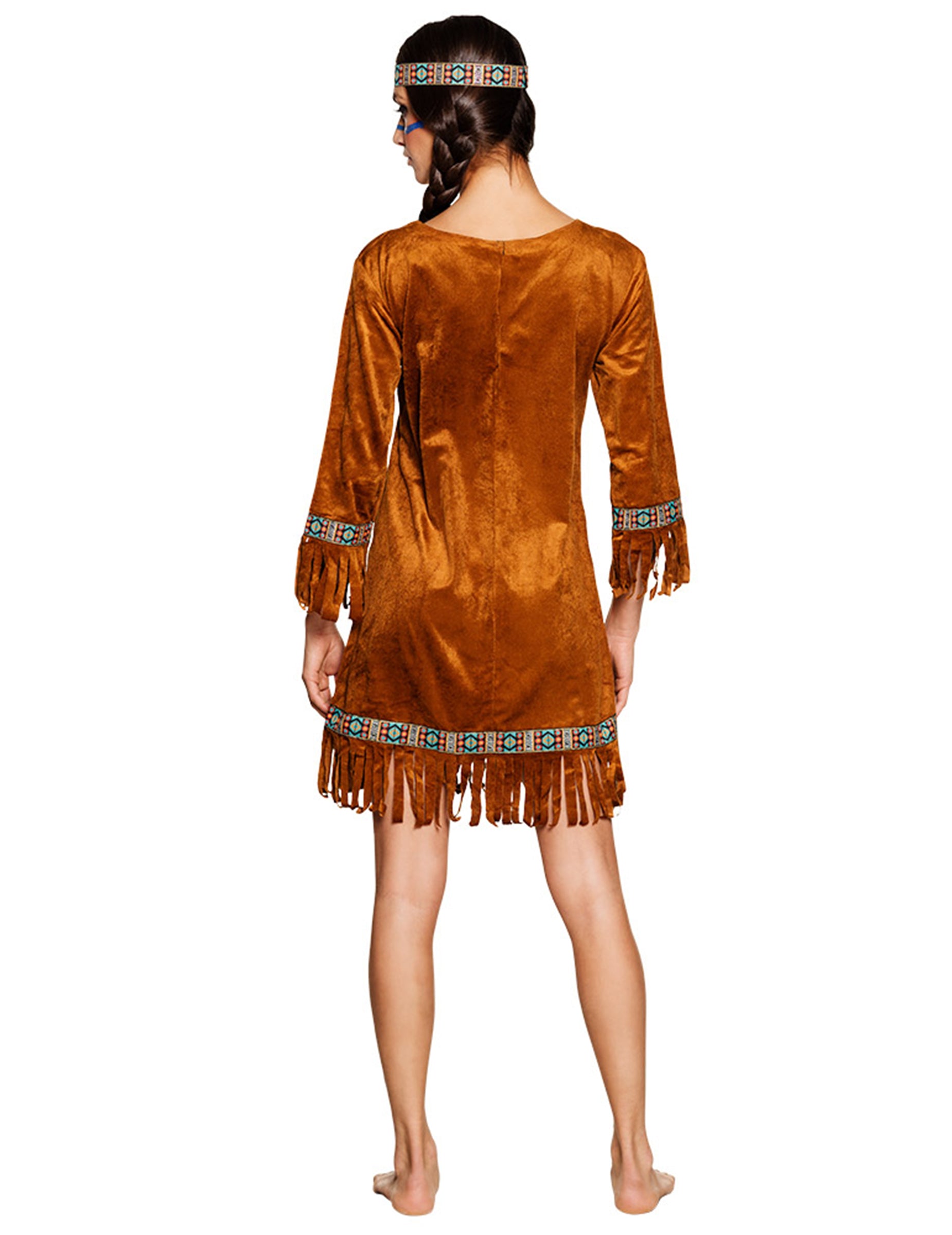 Ez az indiai jelmez a nők számára készült. Van egy ruhája és egy fejpántja. A ruha barna velúr szövetben található. Hosszú ujja van. A galléron, a csuklónál és a szoknya alján lévő rojtok díszítik. Az indiai mintákkal rendelkező szövetcsík a rojtok fölött van jelen a minőség érdekében. A fej körül áthaladó szalag és a ruha illesztése is tartalmazza. Ezzel az álruhával egy gyönyörű indiánot testesítenek meg a nyugati témával álcázott estére. *Ez a rendkívül kicsi méretű ruha Mérethez M.