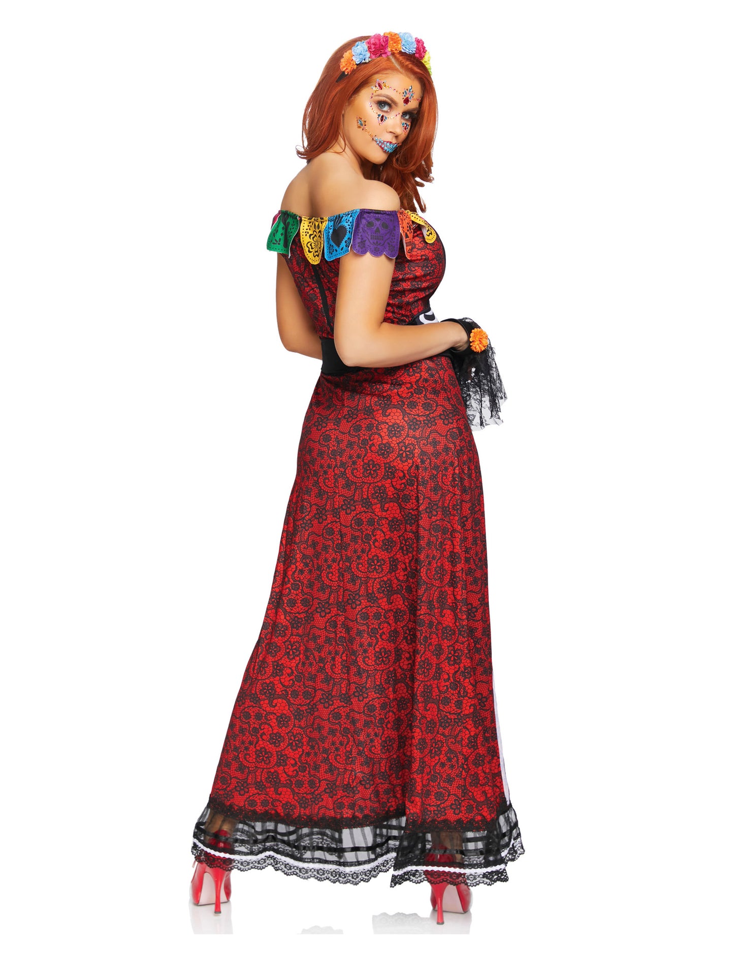 Ez a luxe dia de los muertos jelmez nőknek szól, ruhából, csuklóból, övből és fejpántból áll. A hosszú ruha piros, fekete csipkenyomással. A nyakkivágást színes zászlók díszítik. A ruha alján két hosszú nagyon szexi rés van. A hegyszíj fekete, fehér csontváz nyomtatással. A csukló fekete, lángolt dentell voil. Minden csuklóra sárga virágot helyeznek. A fejpánt többszínű virágokkal van. Ez a Los Muertos Diad jelmez a legszebbé teszi a Halloween estéjén.