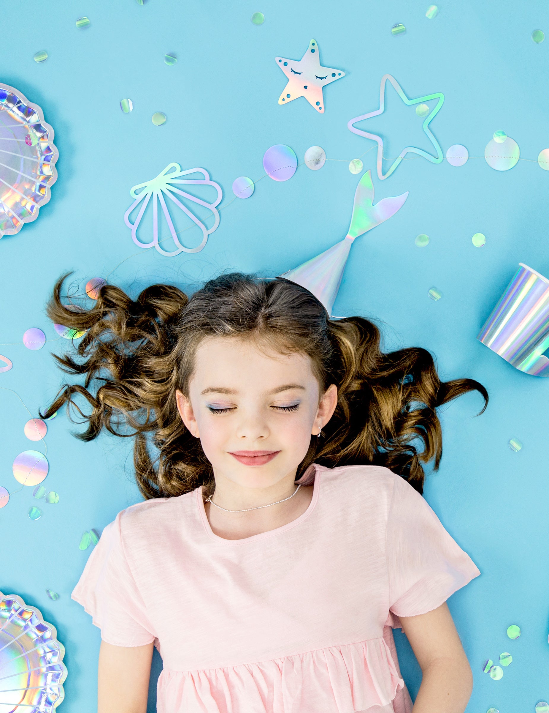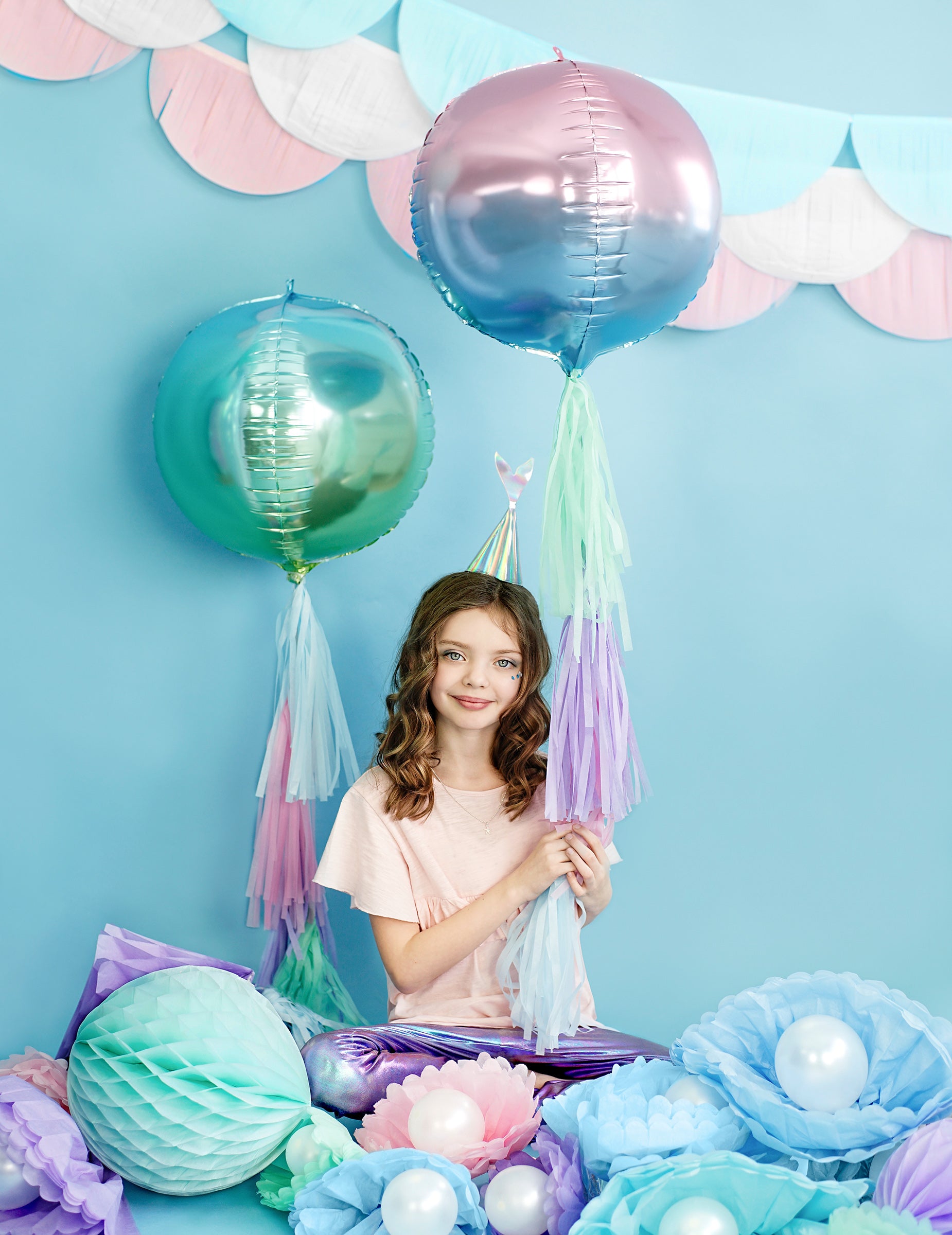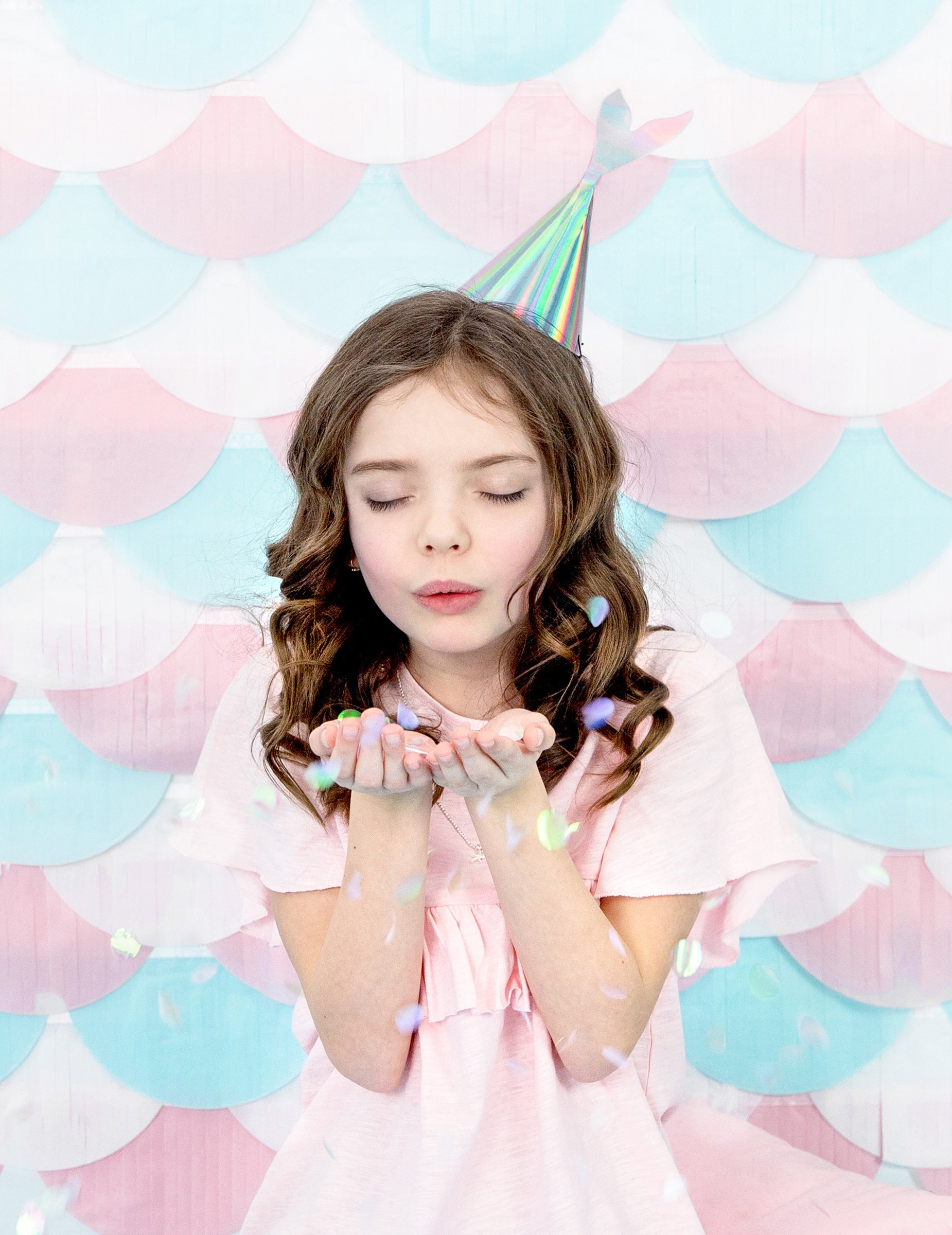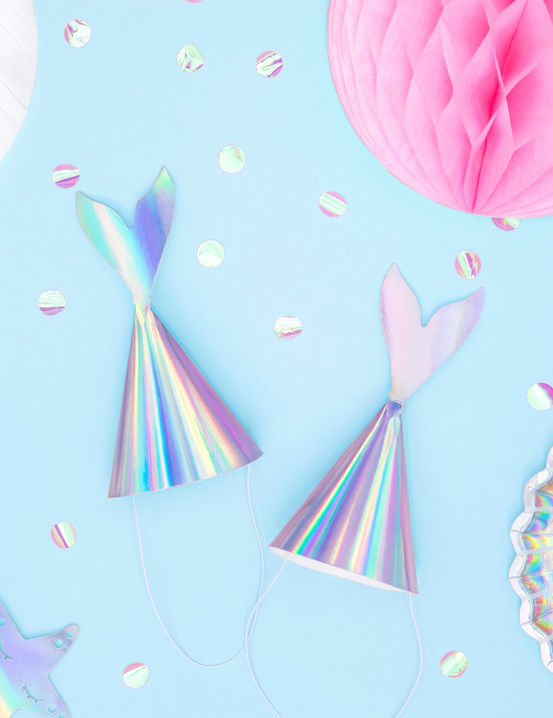A holografikus sellő farok e 6 ünnepi kalapja körülbelül 8 x 18 cm -t mér. Ezek a kalapok kartonból készülnek. Hableány farok alakúak. Irizálóak, a szivárvány színének tükröződéseivel. Ezek a kalapok egy kis eredetiséget hoznak a lányod születésnapjára a szirénák témájára.
