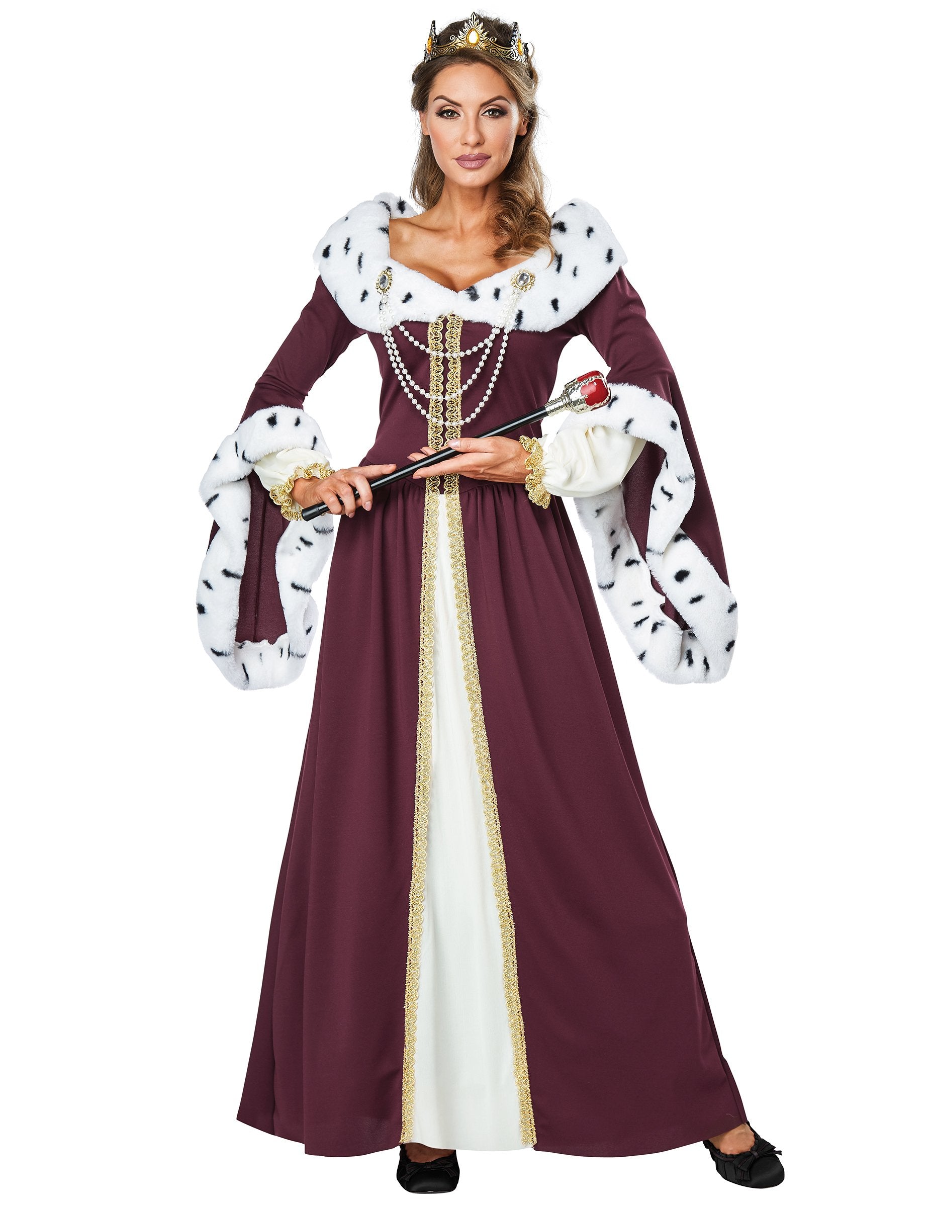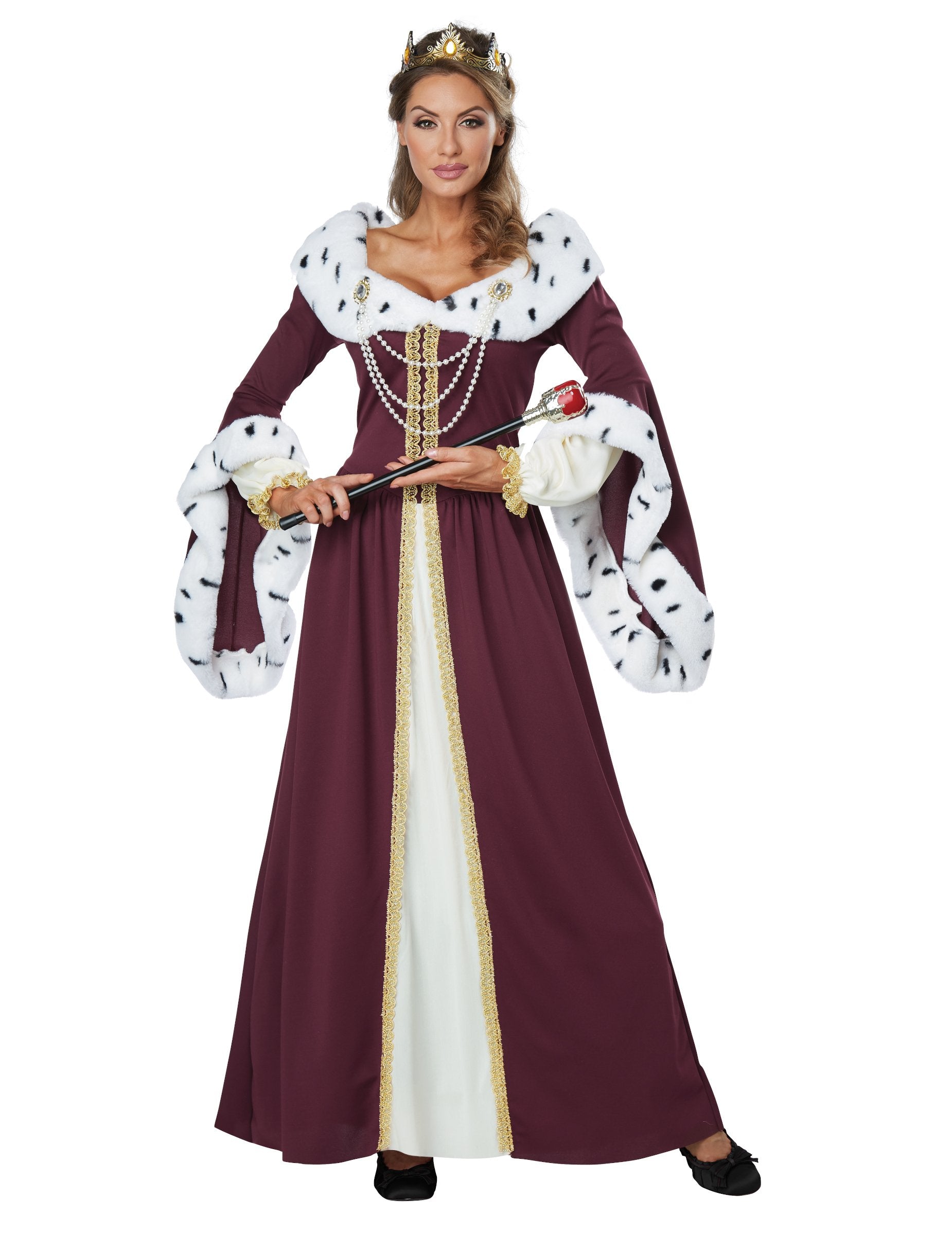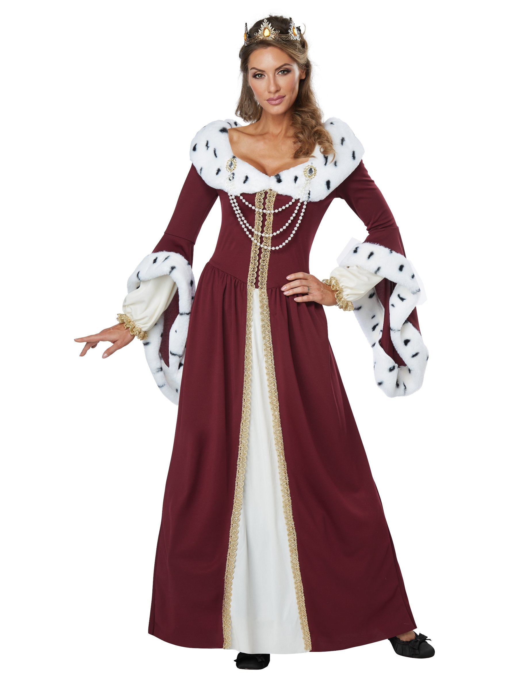 Ez az álruhás, mint a mesebeli királynő, a nők számára ruhát és koronát (scêptre nem tartalmaz). A királynő korona aranyszínű, szép strasszokkal, amelyek borostyán színűek. A ruha hosszú. Burgundia színű. Arany szélek és hamis gyöngyök díszítik a mellszobor ezzel a csinos ruhával. És még több varázsa érdekében a mellkasban van egy fehér, foltos, feketével foltos szőrme, és a hosszú pagodikus hüvelyek fordítottja. Ez a középkori királynő jelmez tökéletes lesz egy középkori témához.
