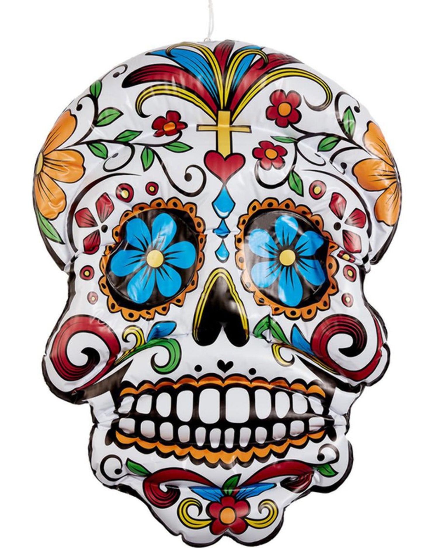Ez a dekoráció felfújható koponyát képvisel. Körülbelül 100 cm -t mér. Ez a koponya fehér, színes virágmintákkal, amelyek jellemzőek a Dia de los Muertosra. Ez a felfújható koponya tökéletes lesz a Halloween dekoráció eredeti és színes módon történő kitöltéséhez.