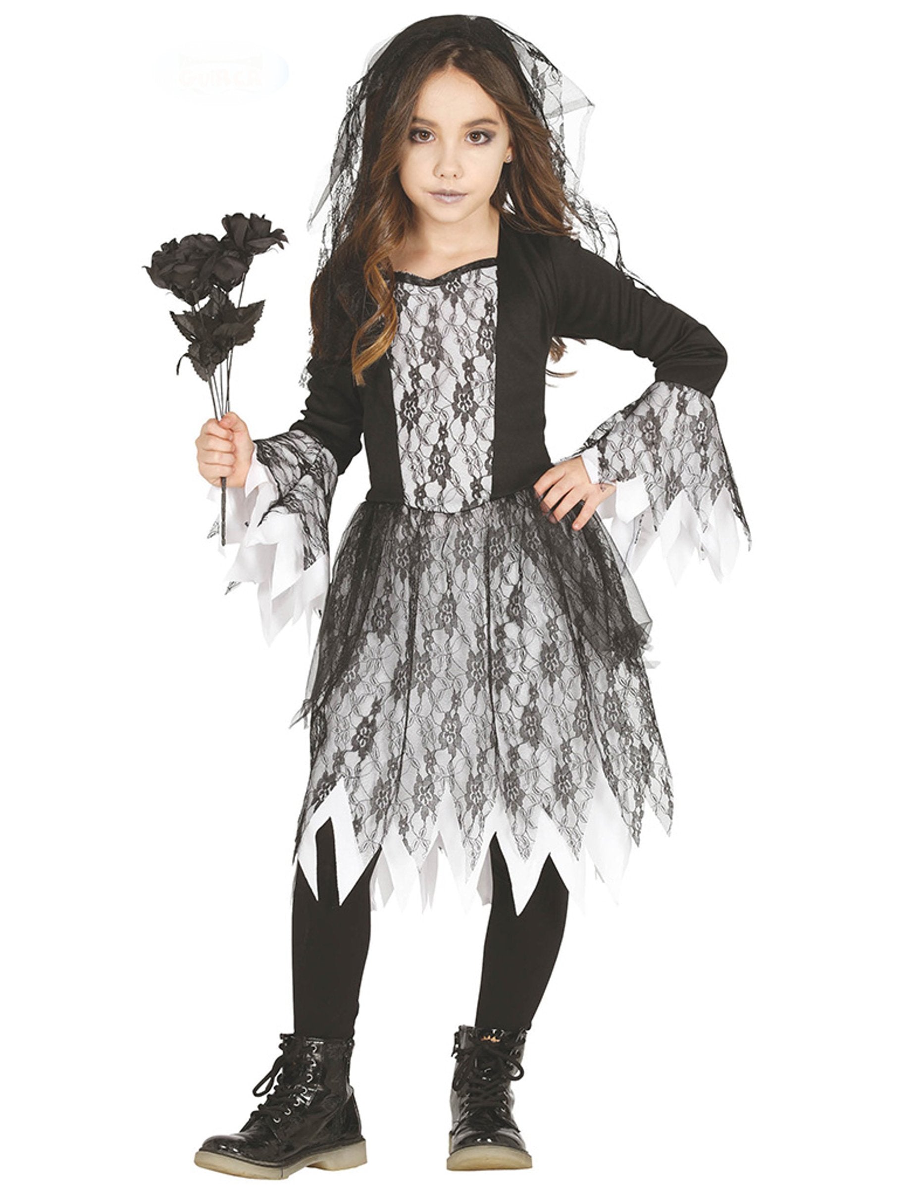A lány hátrányos álcázásának ez a visszaesése ruhából és fátyolból áll (csokor, harisnyanadrág és cipő nem tartozik). A ruha fehér, fekete csipkével az alsónadrágnál és a mellkasabb. Az ujja fekete. A fátyol fekete csipkében van, fejpántra rögzítve. Ez az élénk halott menyasszonyi jelmez tökéletes lesz a lányának, hogy elbűvölje a Halloween estét!