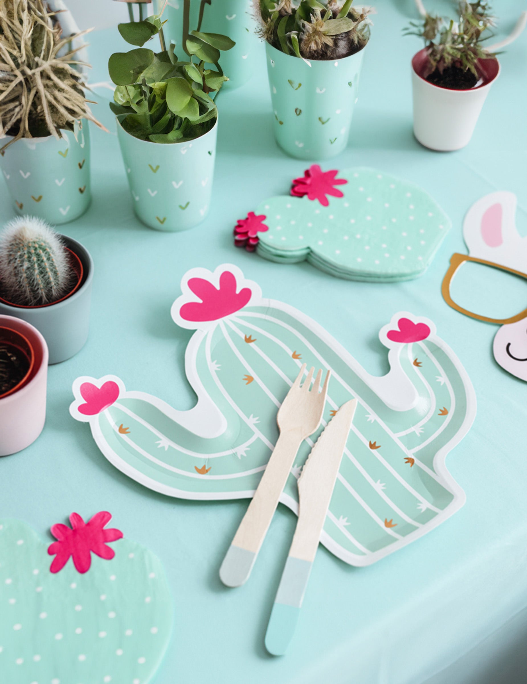 Minden darab hozzávetőleges mérete 23 x 24 cm. Ezek kaktusz tányérok egzotikus és színes hangulatot kölcsönöz az asztaldísznek egy születésnap ünnepi mexikói vagy láma témával.