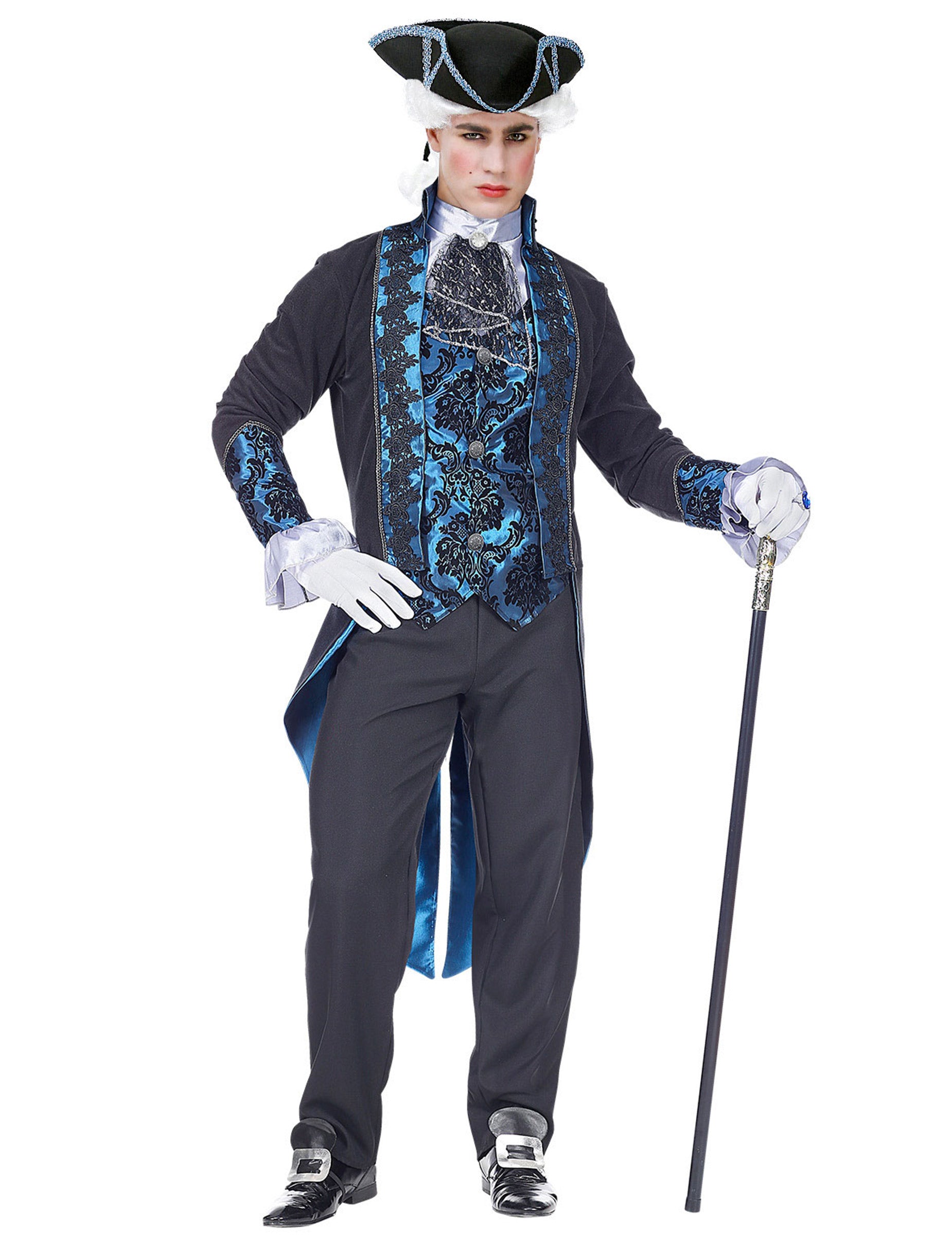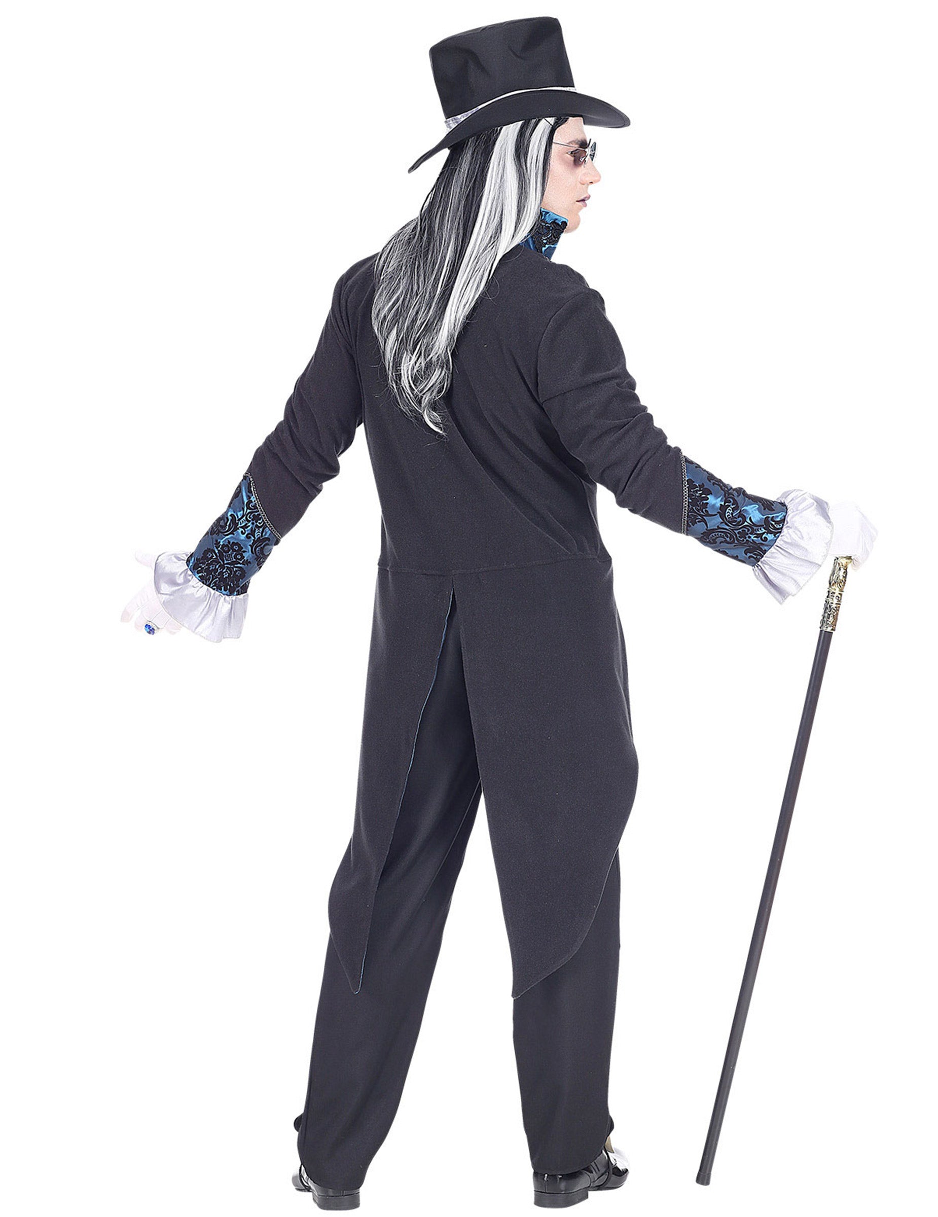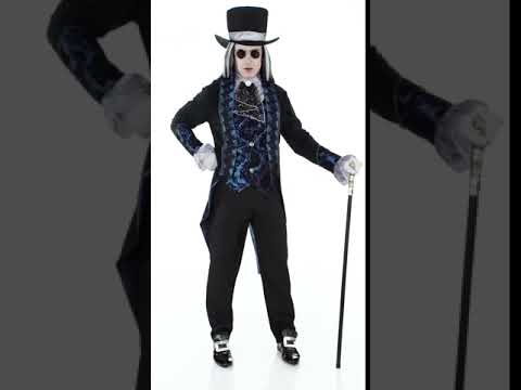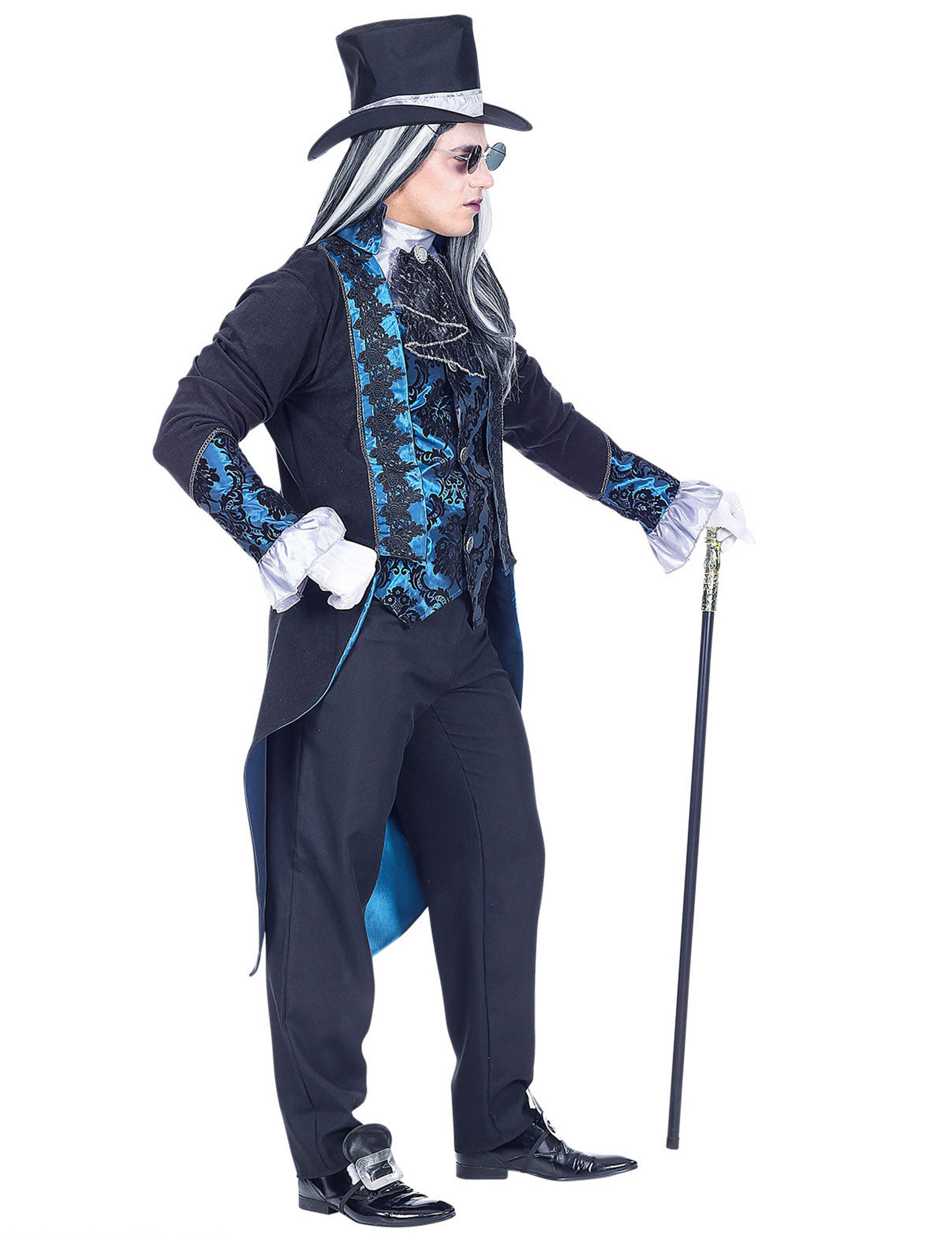 Ez kék viktoriánus vámpír jelmez férfiaknak készült, egy mellényből, egy zsakóval ellátott ingből, nadrágból és egy cilinderből áll (szemüveg, kesztyű, bot és cipő nem tartozék).