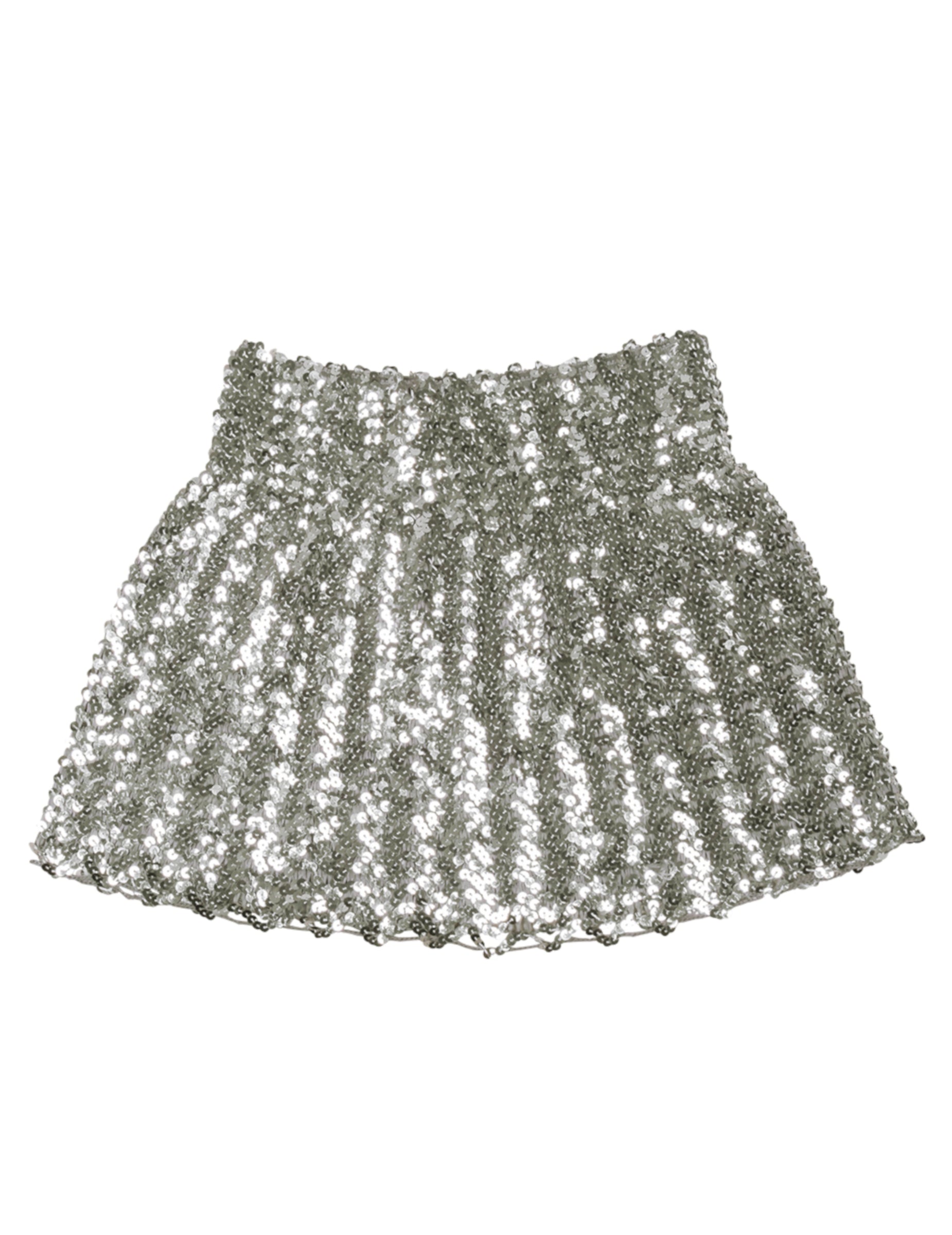 Ennek a nő szoknyájának ezüst flittere van borítva. Egy rugalmas anyagból készül, amely alkalmazkodni fog a derekához. Ez a szoknya tökéletes lesz a legrosszabb disco jelmezhez!