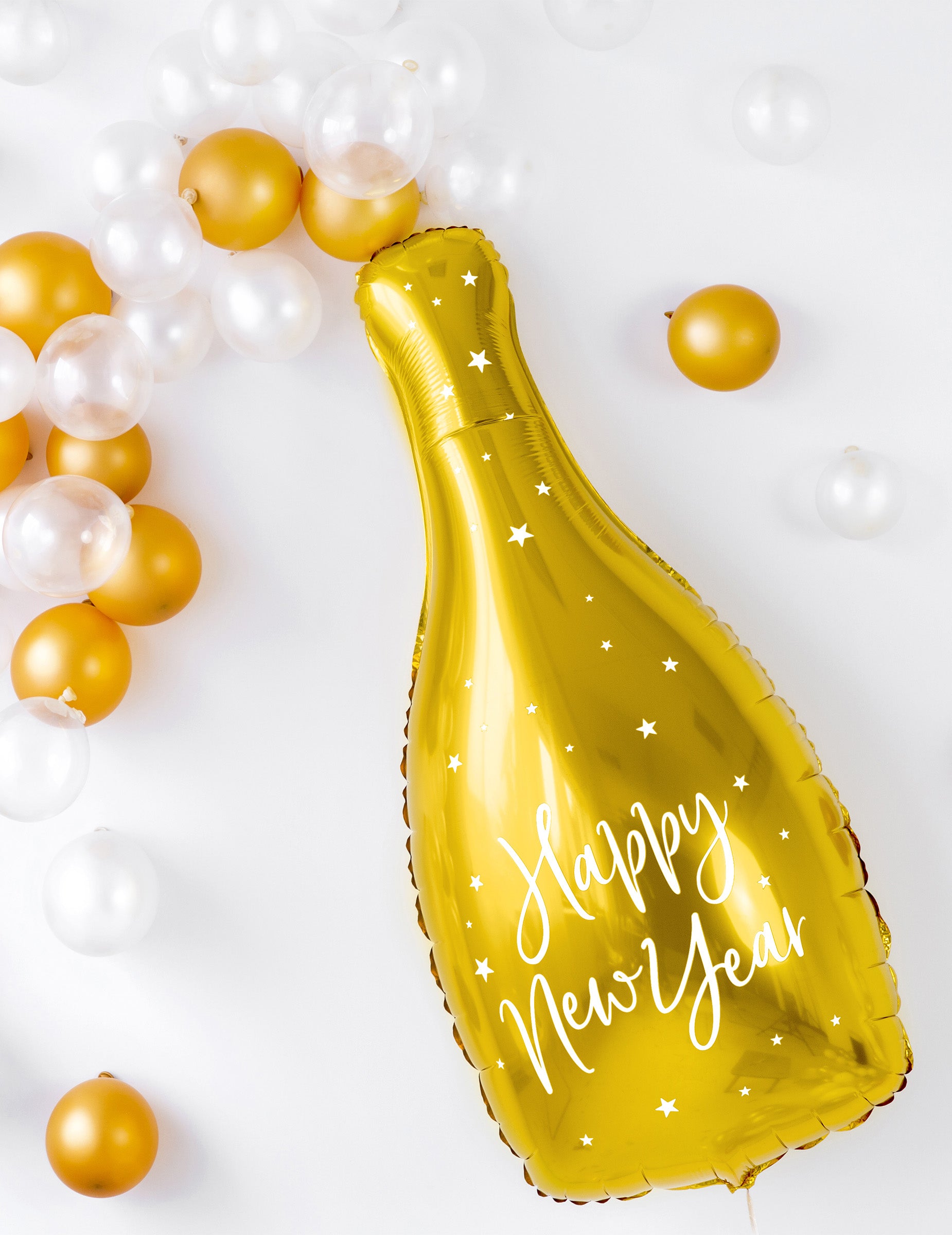 Ez a ballon arany üveg alakú. Alumíniumban körülbelül 32 x 82 cm -t mér. A "boldog új évet" szavak meg vannak írva. Duzzad a levegővel vagy a héliummal, hogy repüljön. Ez a palackgolyó tökéletes dekoráció lesz az újévre!