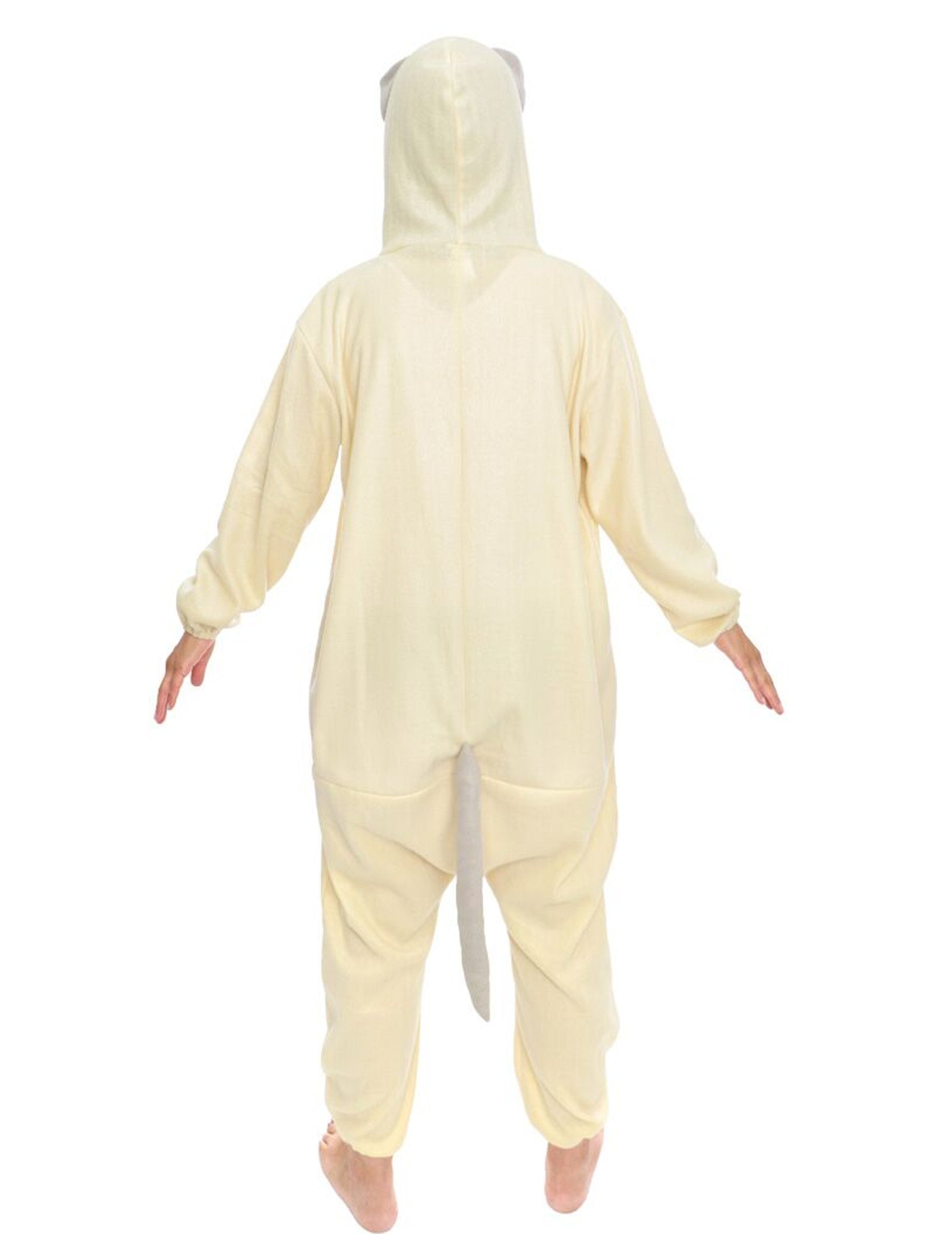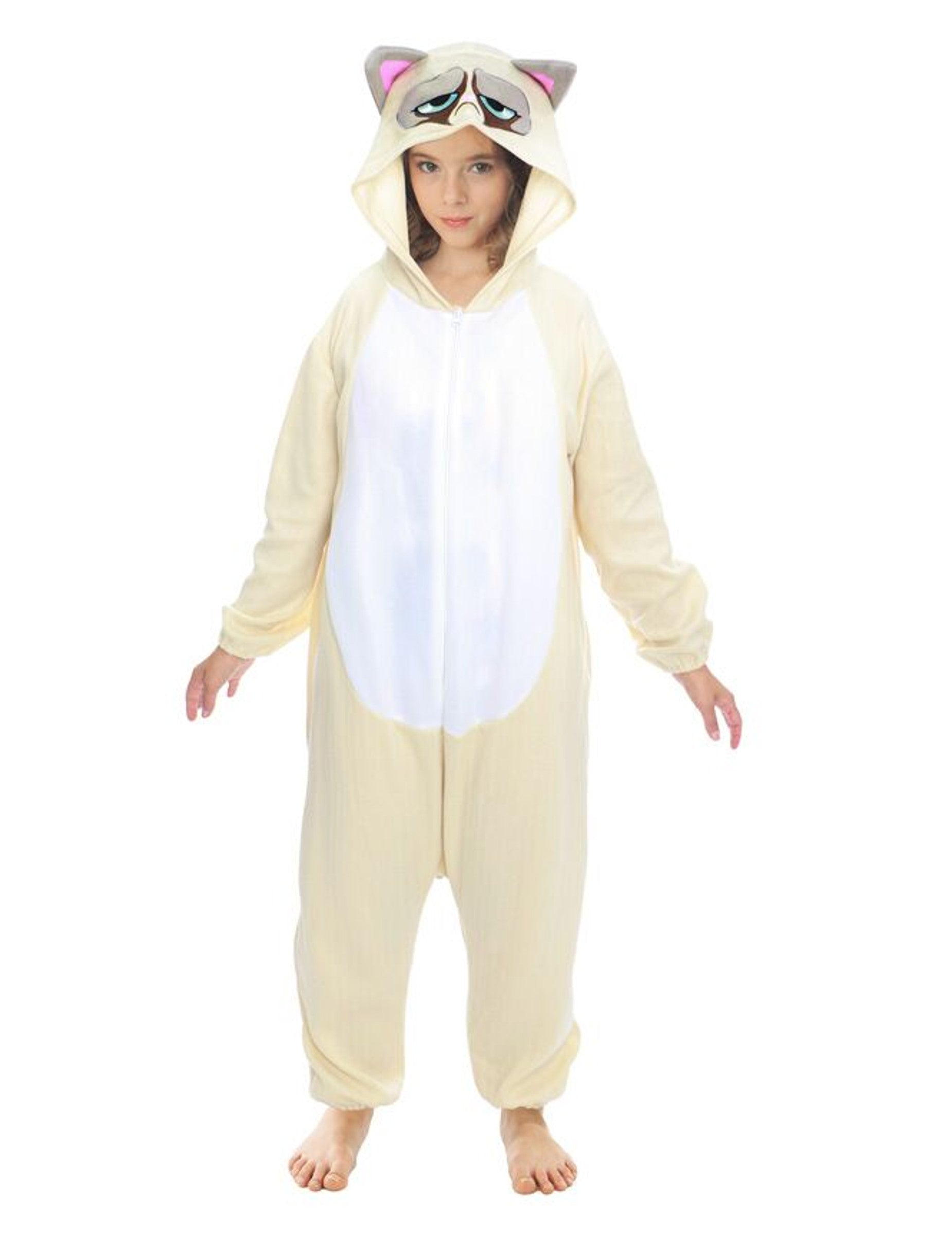 A kezeslábas kapucnija Grumpy cat morcos fejét ábrázolja.