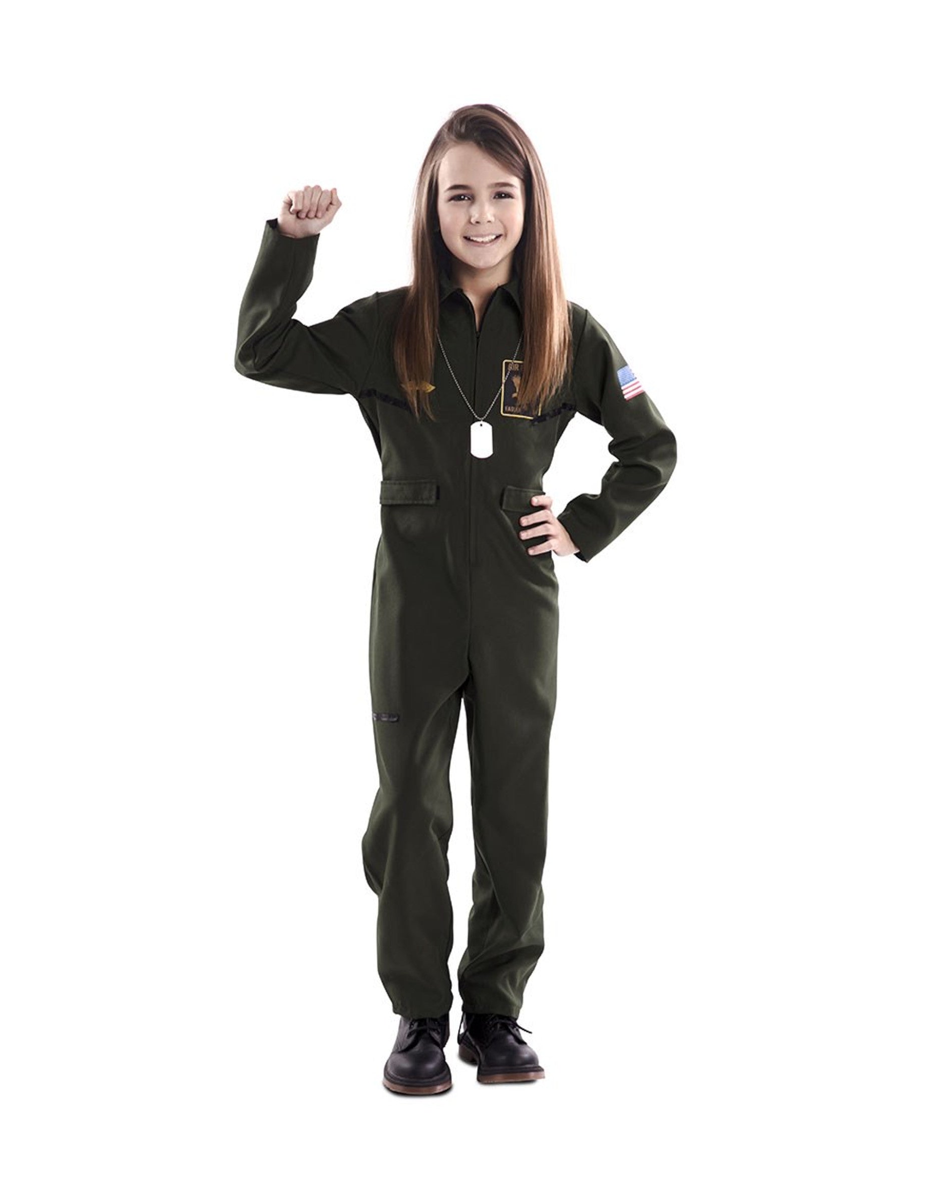 A hosszú overall khaki zöld színű. Egy amerikai felvarró található az egyik ujjon. Az air force logók és felvarrók a másik ujjon és a mellkason helyezkednek el. Az elején cipzár található, akárcsak a valódi katonai pilóták overallján. Hamis zsebek és gallér teszik teljessé ennek a jelmeznek a részleteit.